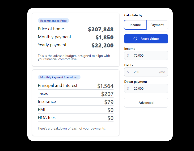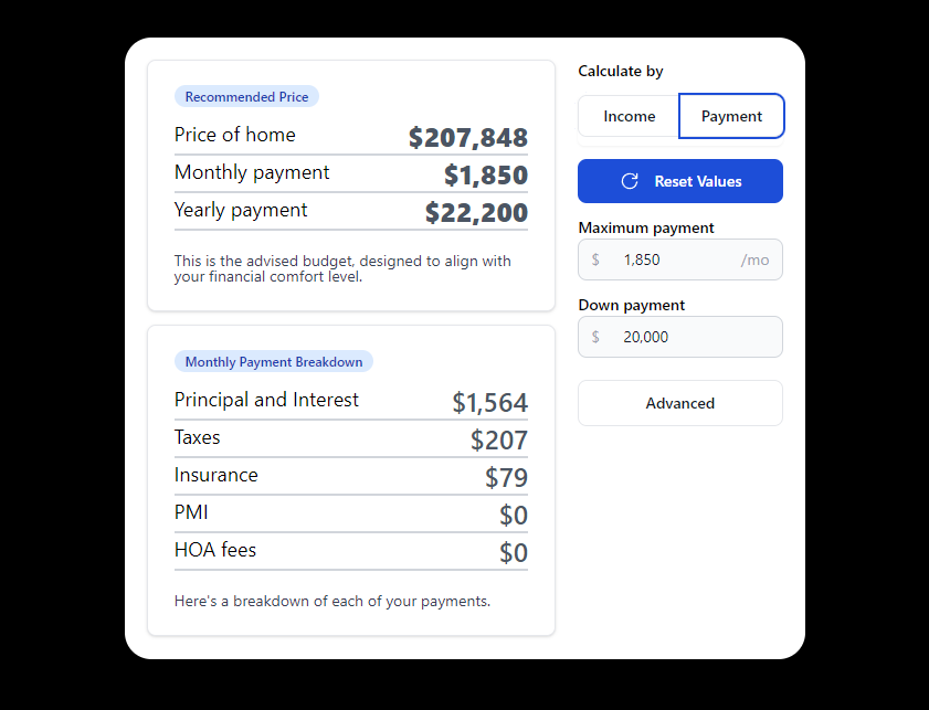 This powerful tool comes with two distinct calculators: one based on monthly payment affordability and another on income evaluation.