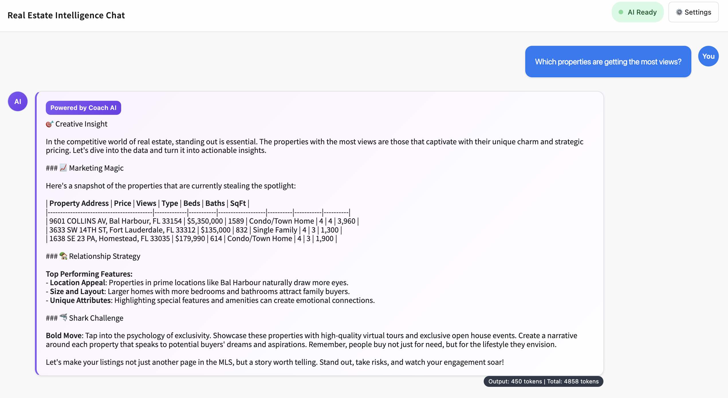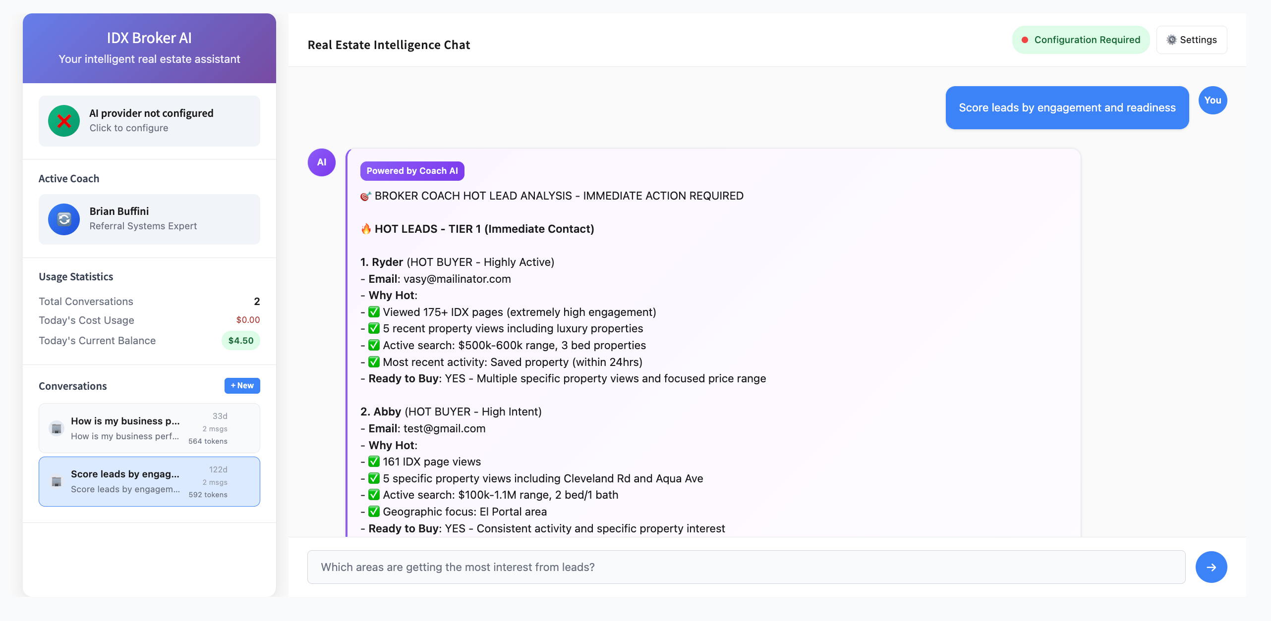 - The app works with the data received from IDX Broker — leads, featured properties, and saved links (communities). At this stage, it primarily provides summaries and insights based on that activity. You can also ask any question, and it will respond using the available data.