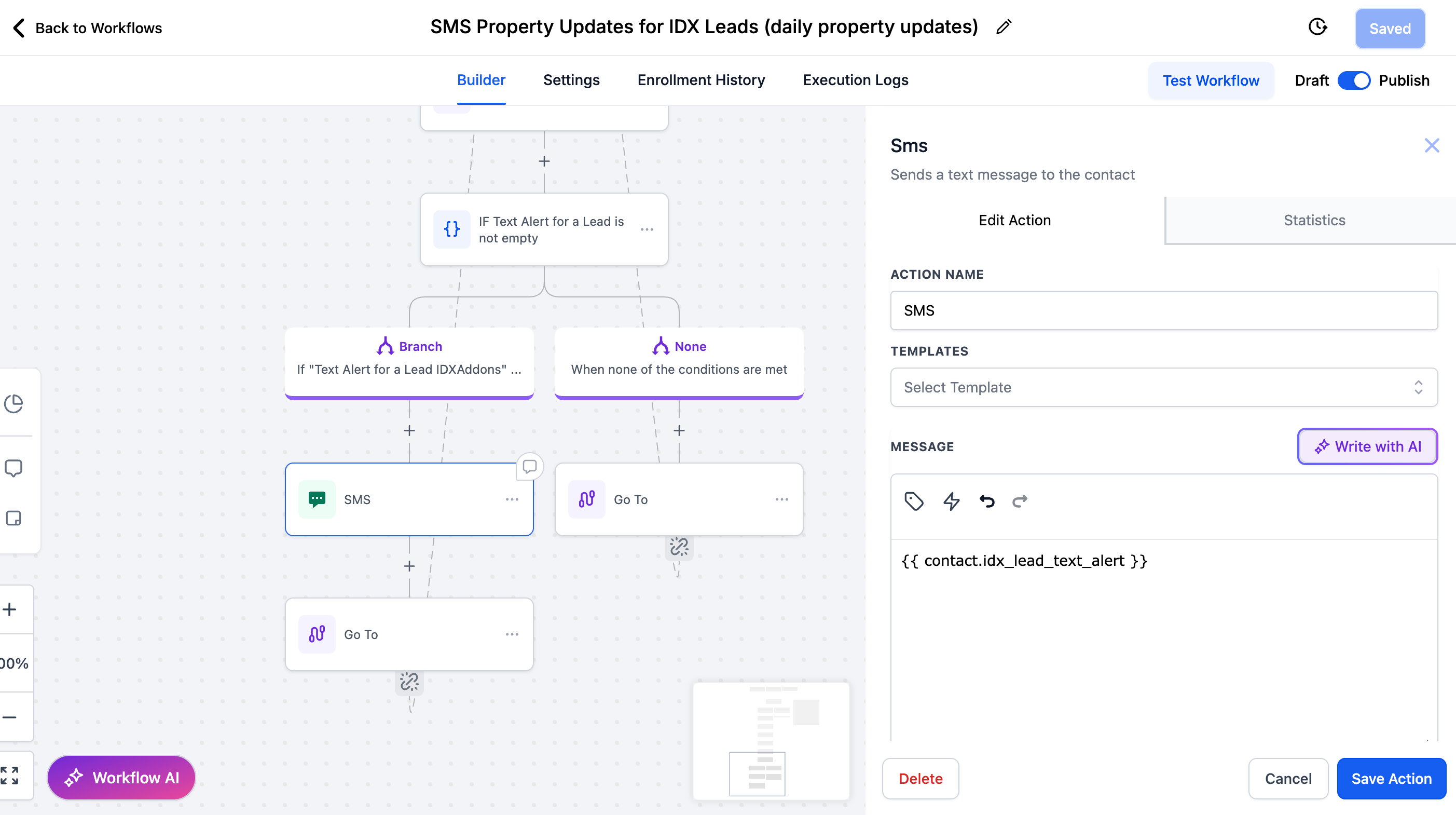 Once the workflow SMS Property Updates for IDX Leads is imported, your leads will receive automated text messages with new listings from their saved searches. You can edit the workflow, customize the SMS template, and publish changes—ensuring your messages are timely, relevant, and personalized.