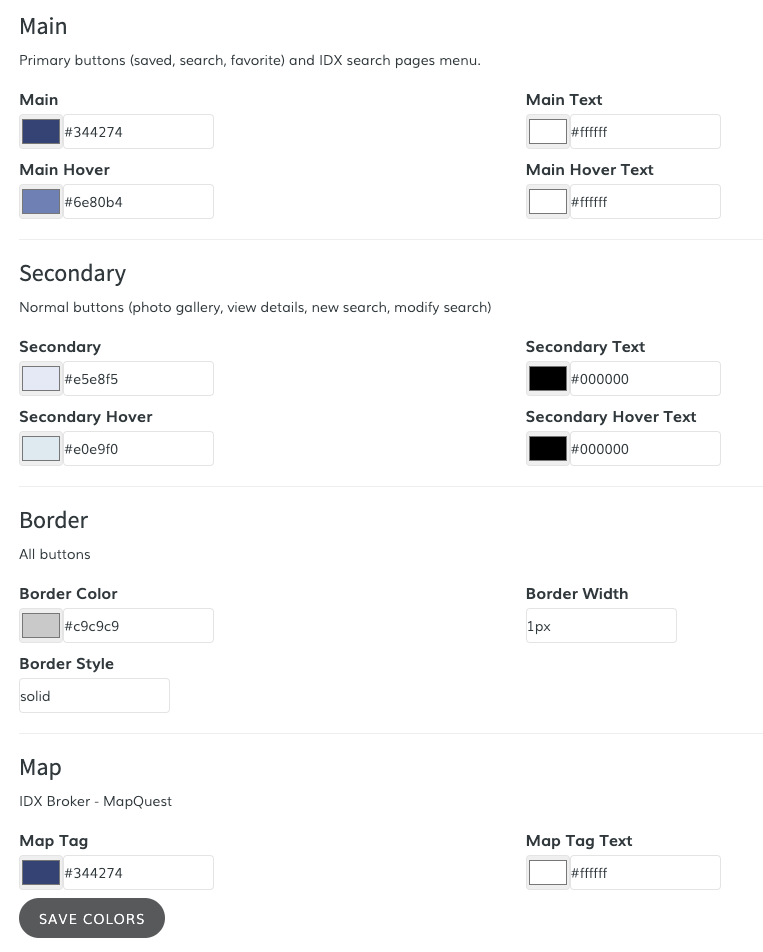 Customize the colors of your IDX Broker pages. It will change menu, map pins, links and button colors on the IDX pages.