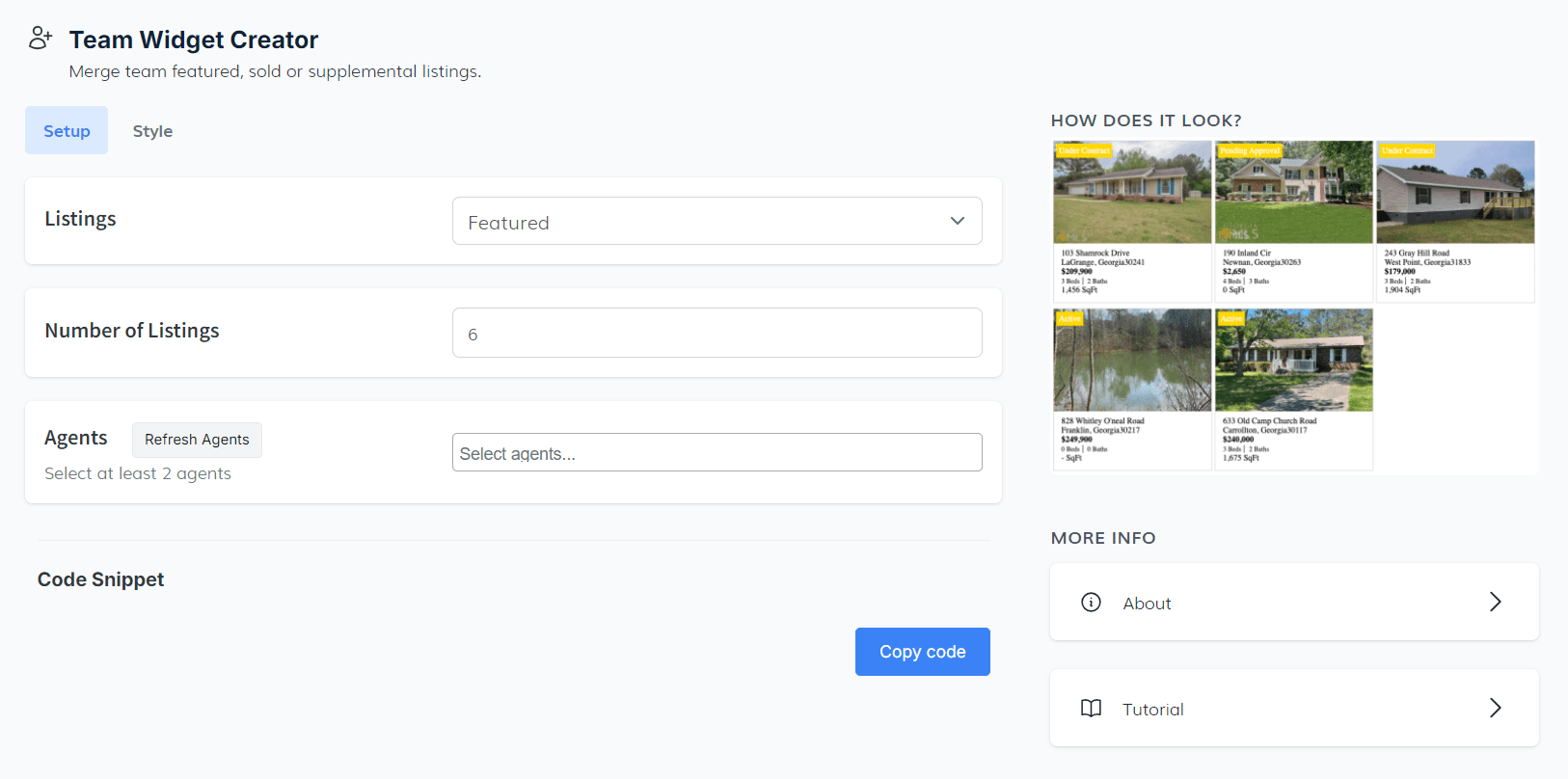 The Team Widget Creator allows users to display combined listings from multiple agents, providing a unified view of available properties. This tool enhances flexibility by allowing customization of the widget to feature active, sold, or supplemental listings.