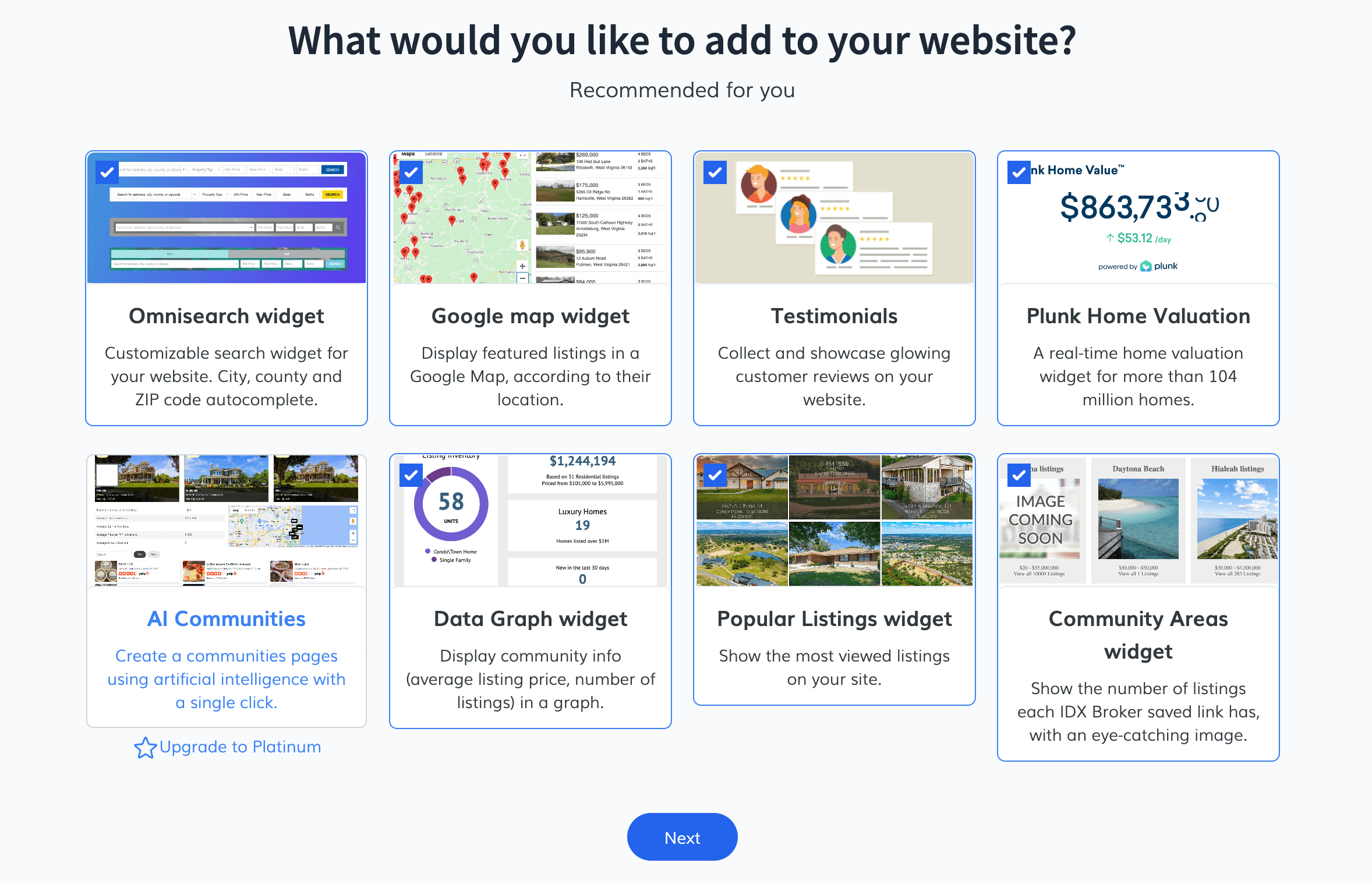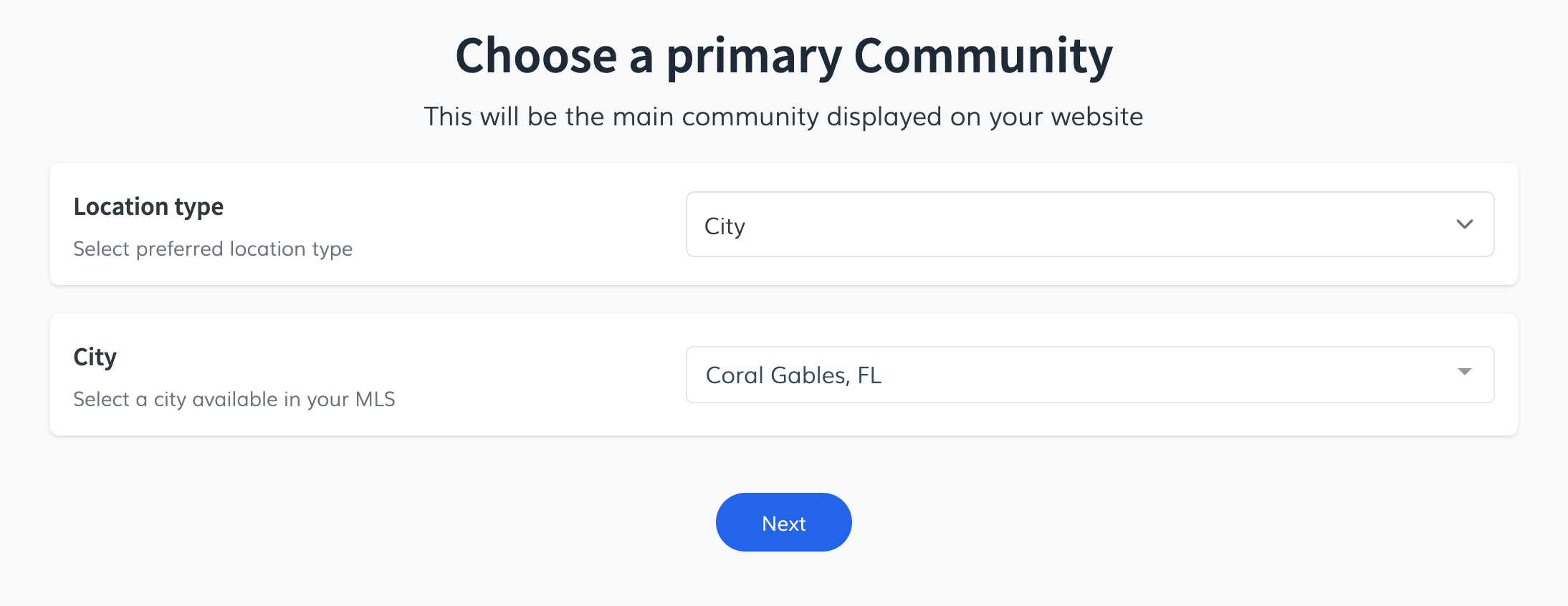 Select a primary community for your website. This will be the main city or county featured prominently. The available options are pulled from your MLS. We will create an IDX Broker Saved Link for this location and, for IDX Broker Platinum clients, a dedicated community page as well.