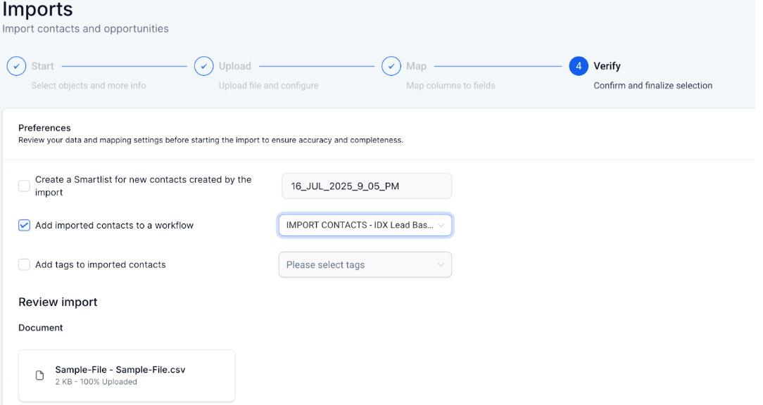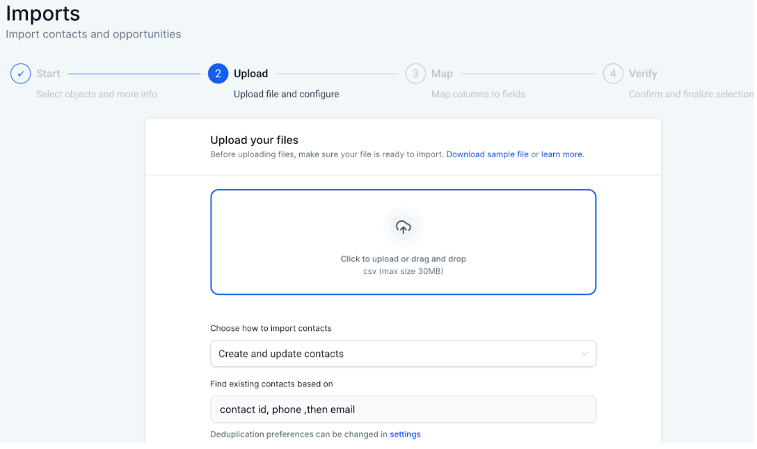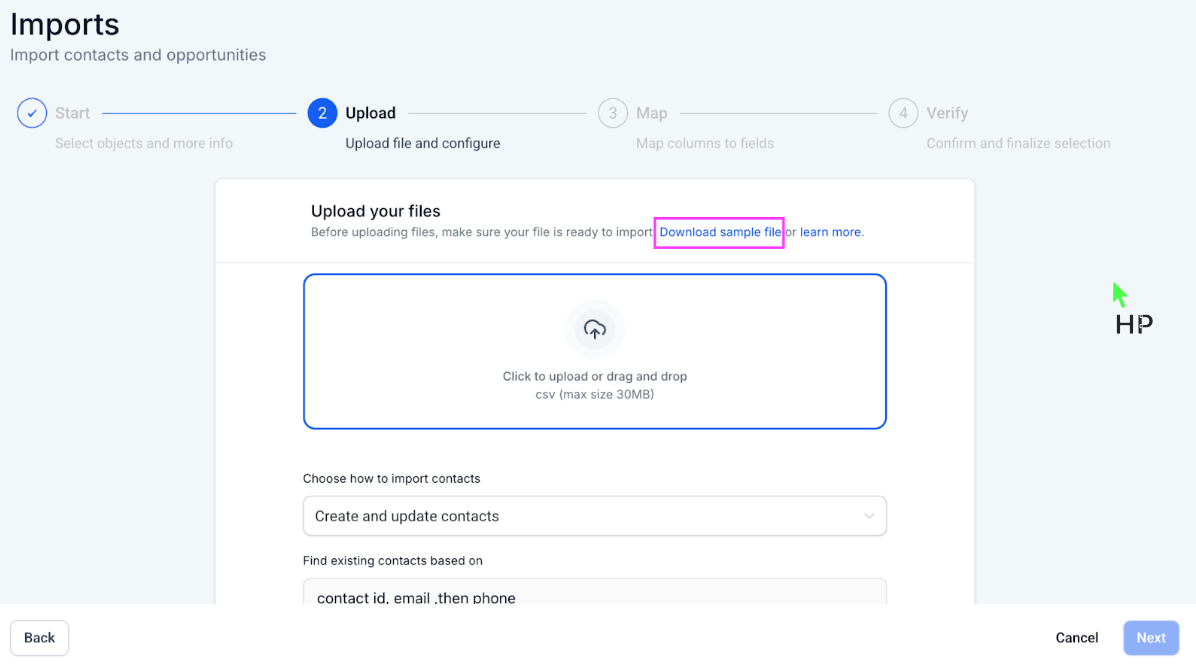 ๐ Step 2: Use the Sample-File.csv provided by HighLevel to import contacts using a CSV file