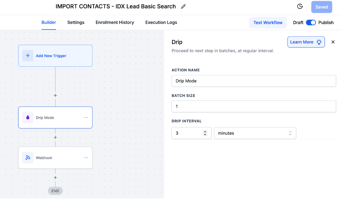โ ๏ธ Important: Add a Drip action to avoid sending all the contacts at the same time. If this is not done, your IDX Broker account will reach out the API Limit access per hour, incurring several errors.