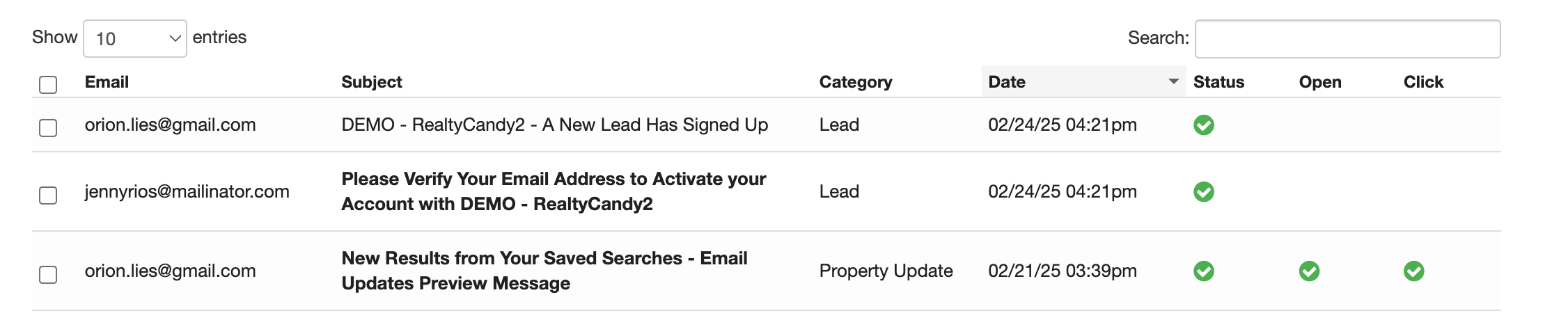 - Sent by Me Displays verification emails and property updates sent to your leads.