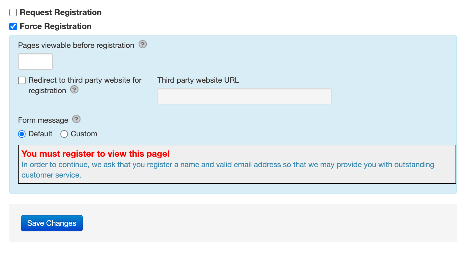 - Pages Viewable Before Registration: Define how many pages a user can view before the forced registration pop-up appears. For example, if you set it to 10 pages, the form will appear after the 10th page view.