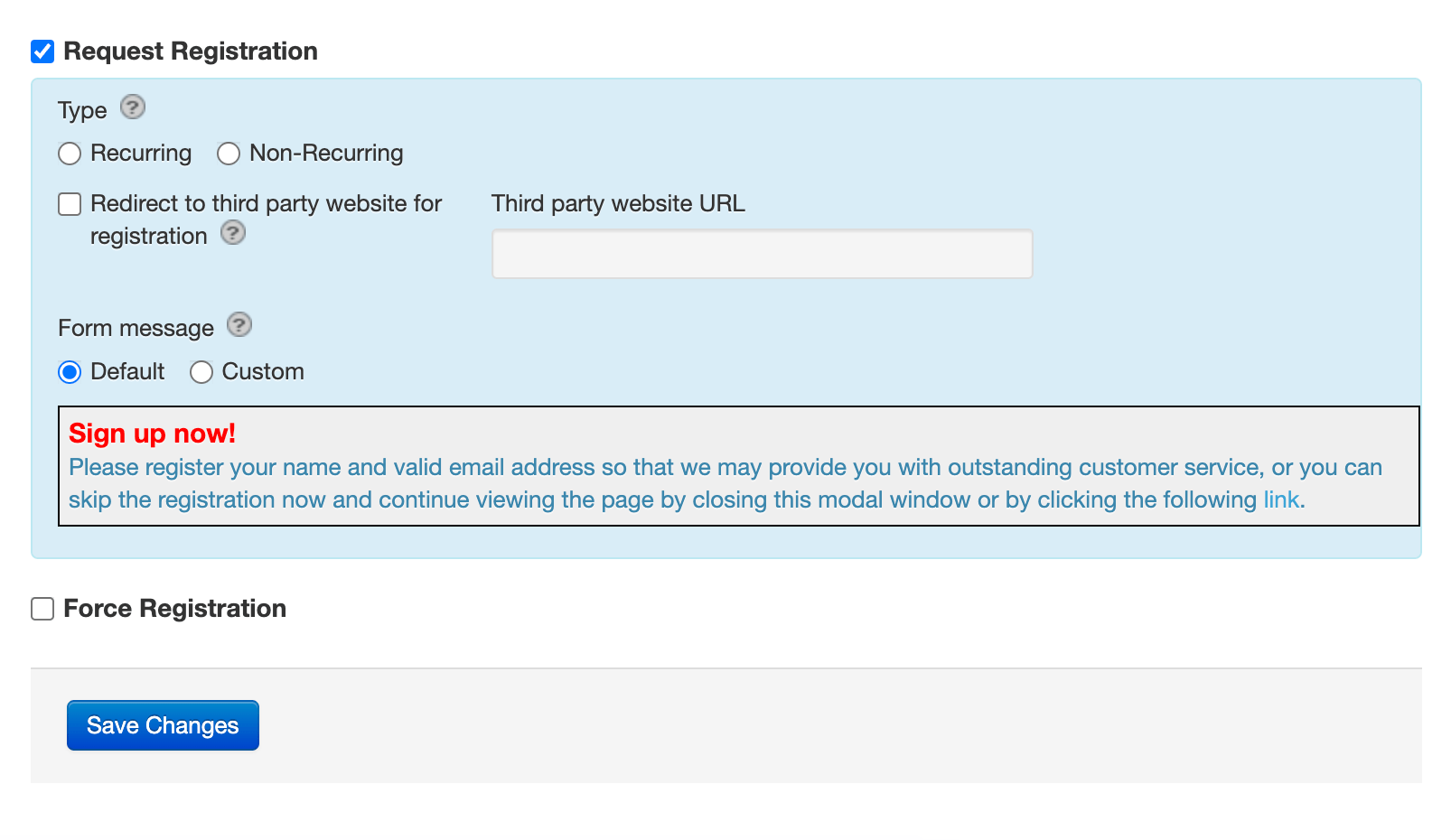 - Non-Recurring: Displays the registration form once after a specific number of page views. If the user bypasses it, the form won’t appear again.