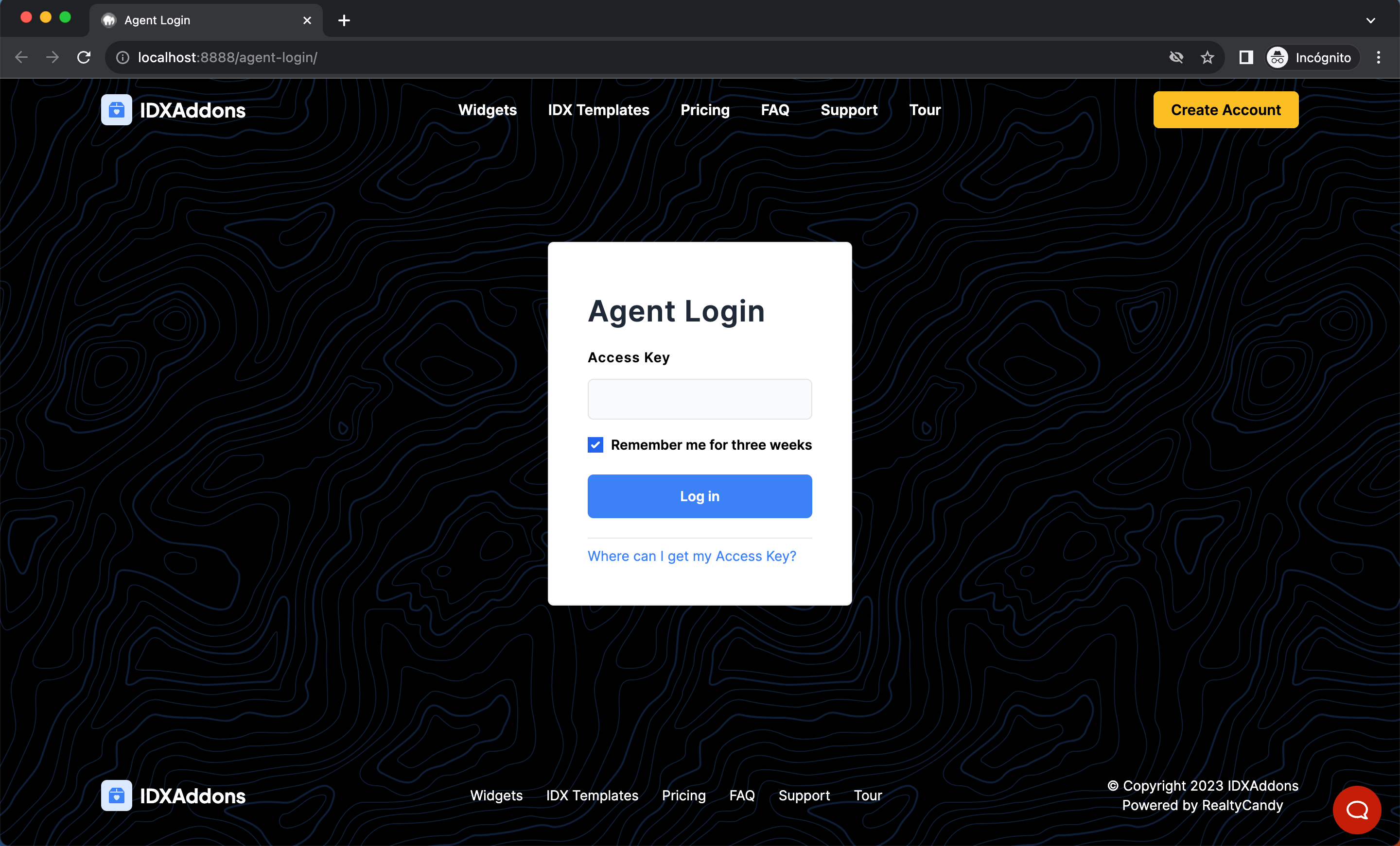 IMPORTANT: If you want to test the agent access and you already have an IDXAddons session, use an incognito window.