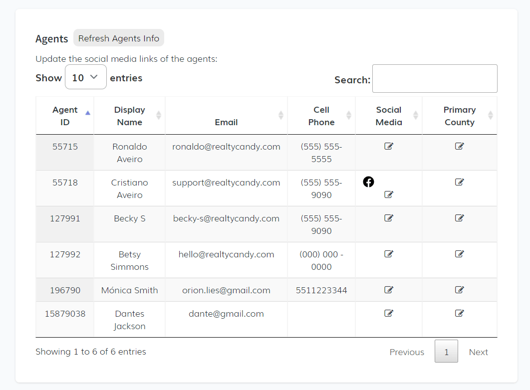 Upon accessing the app, you will see the Setup tab. In the first section, there is a data table where you can update social media links for agents. The table includes the following fields:
