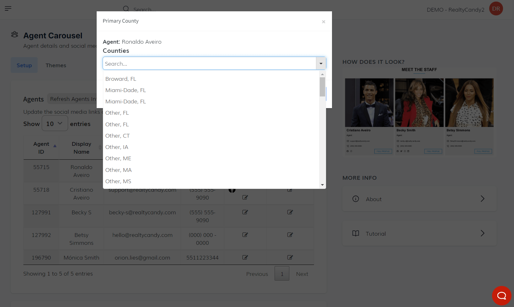 For the Primary County field, clicking it will open a pop-up window with the agent's name and a dropdown selector to choose a county from the available options. After selecting the county, click the update button to save the changes. Additionally, there's a Refresh Agents Info button to update the data.