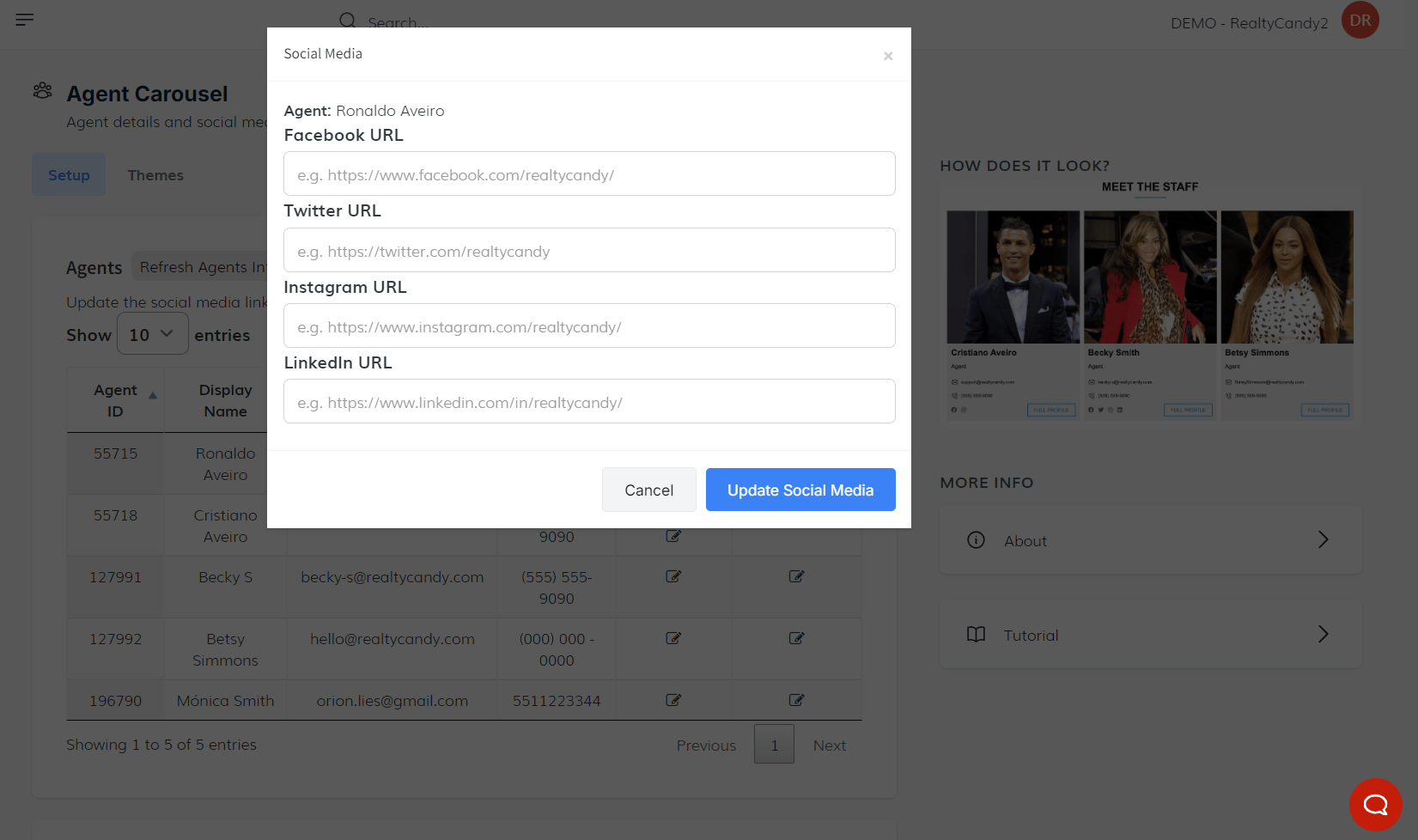 For the Social Media field, there is an edit button. Clicking it opens a pop-up window, which displays the agent's name (e.g., Ronaldo) and fields to input URLs for Facebook, Twitter, Instagram, and LinkedIn. Once all the information is entered, click the "Update Social Media" button.
