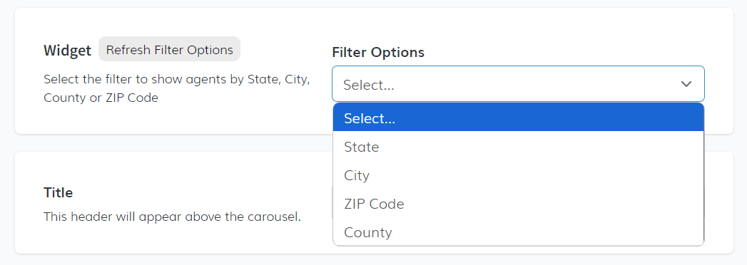 Next is the Widget section, where you can choose filters to display agents by state, city, county, or ZIP code. Click the select dropdown and pick the most relevant option.
