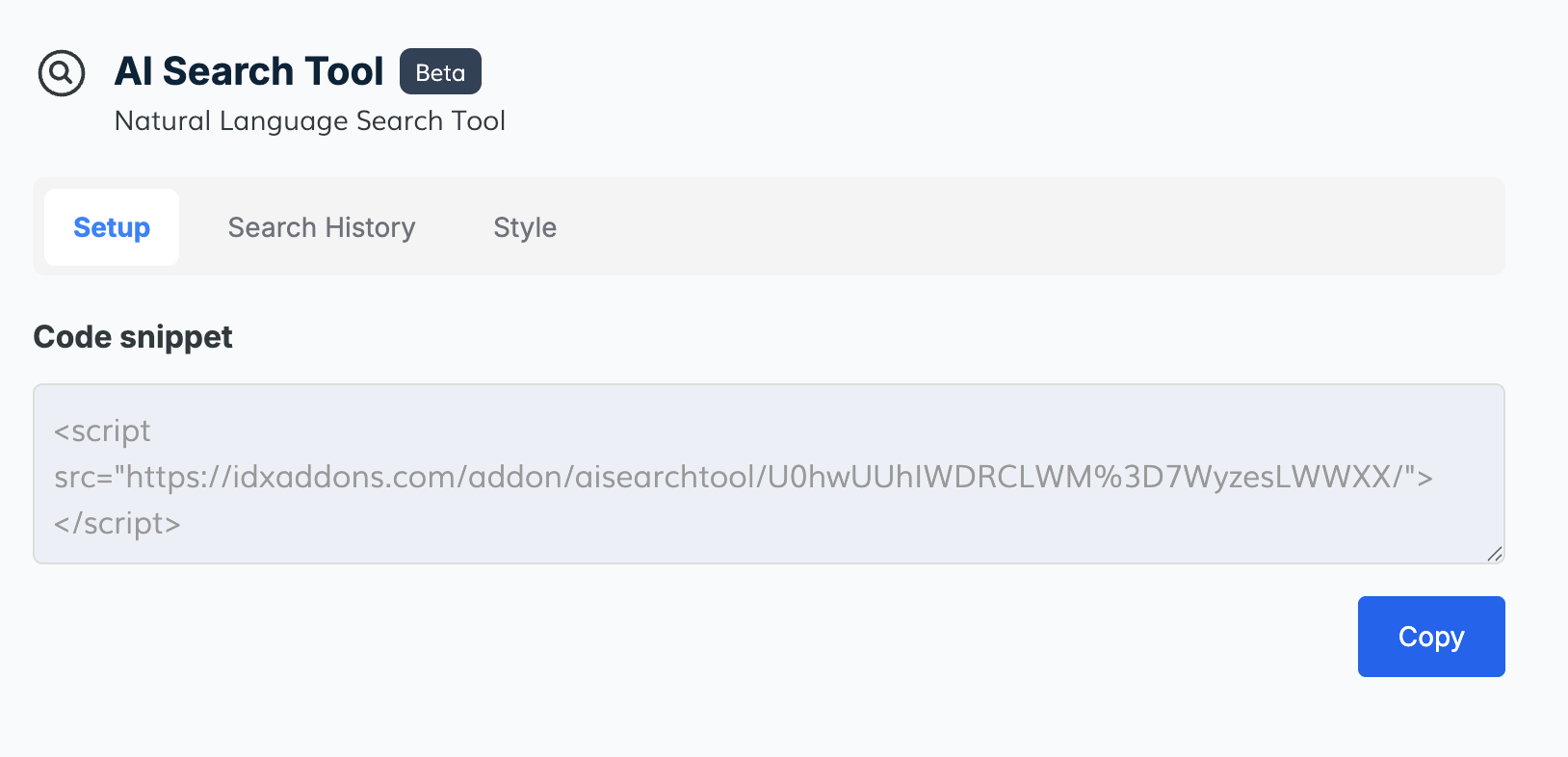 In the Setup tab, you'll find the code snippet needed to enable the widget on your site. Simply copy the script and paste it into your website's HTML or through your platform’s custom code injection area.
