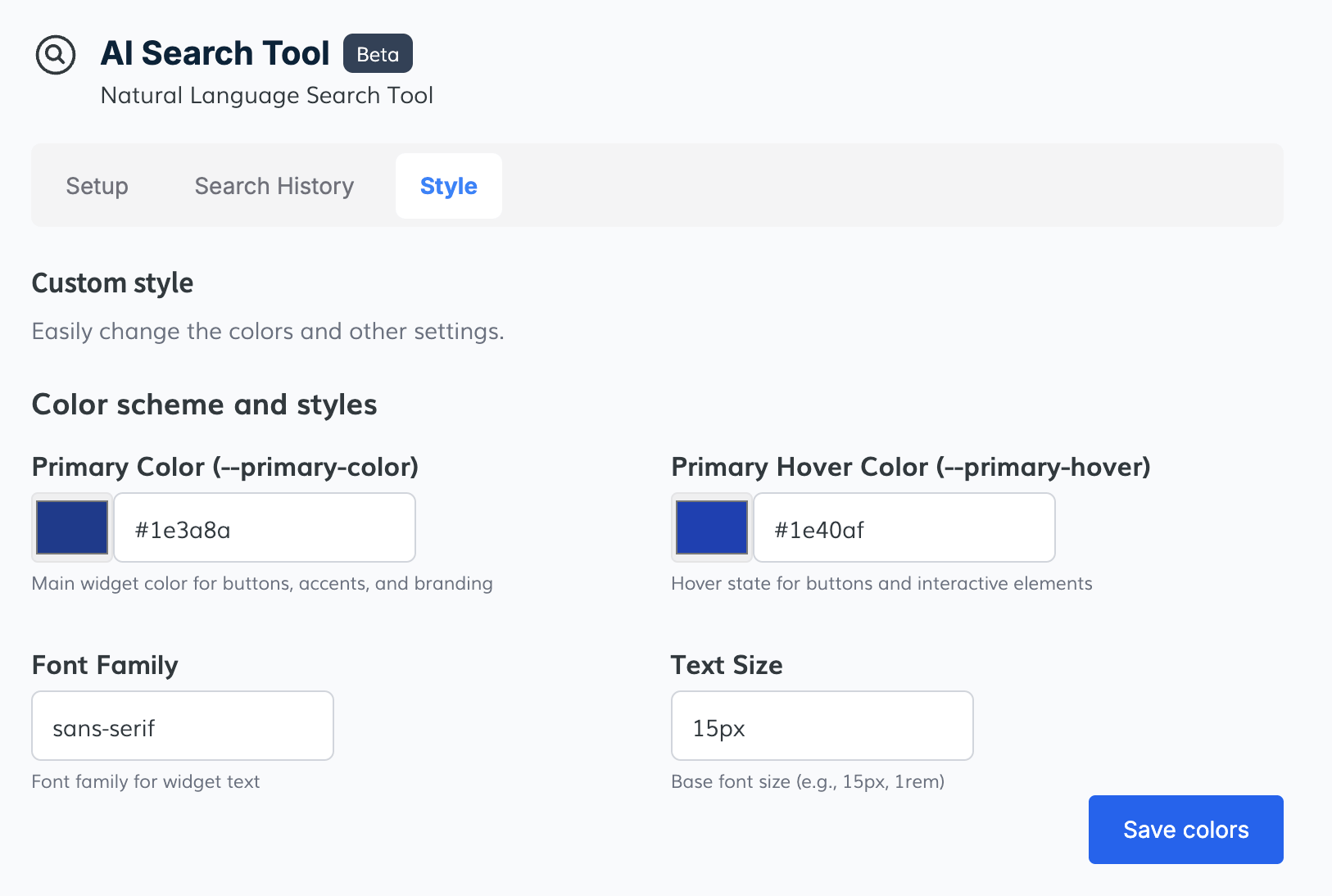 Use the Style tab to customize the visual appearance of the AI Search widget and seamlessly integrate it with your brand: