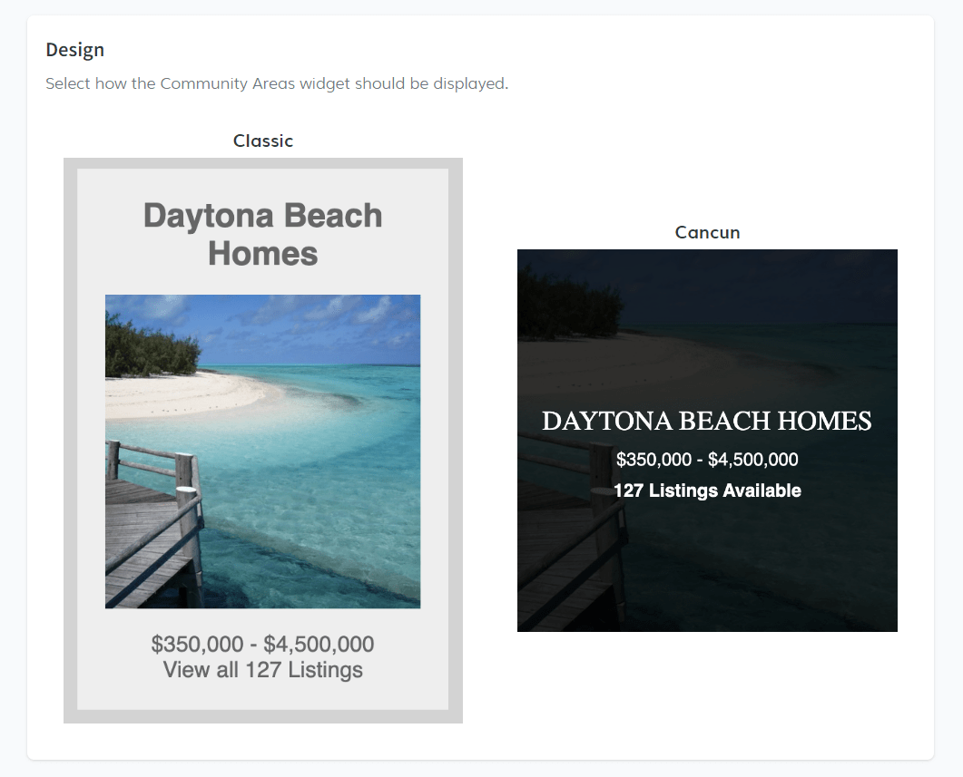 In the Style tab, you’ll begin by selecting the design for your Community Areas widget. You have two options to choose from: Cancun and Classic. Select the style that best fits your preference.