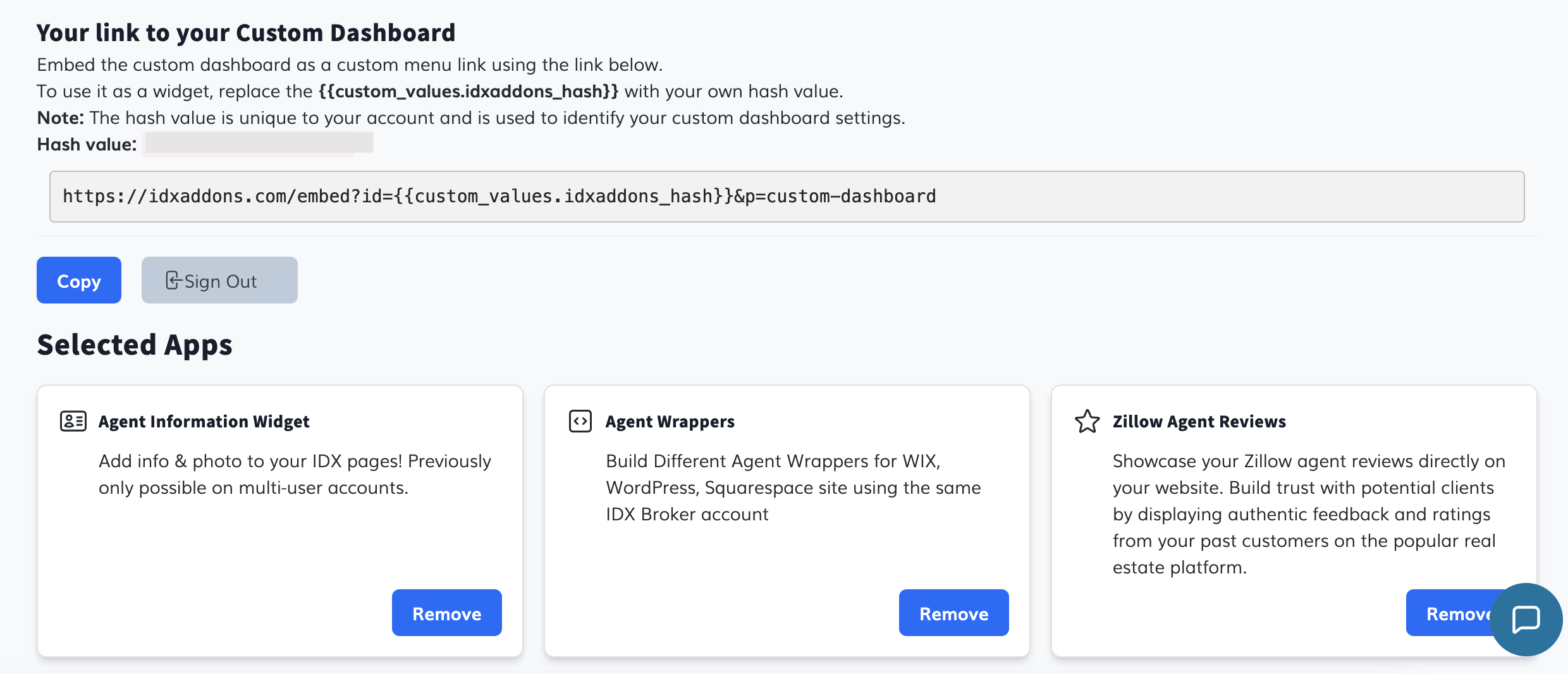{{custom_values.idxaddons_hash}}with your own hash value.Note: The hash value is unique to your account and is used to identify your Custom Dashboard settings.