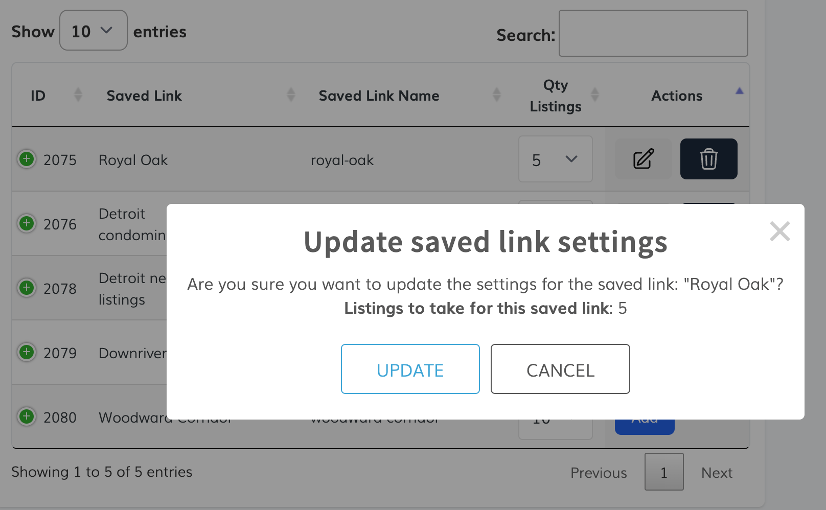 A popup will show up with the Saved Link details and number of listings. Click on the "Update" button.