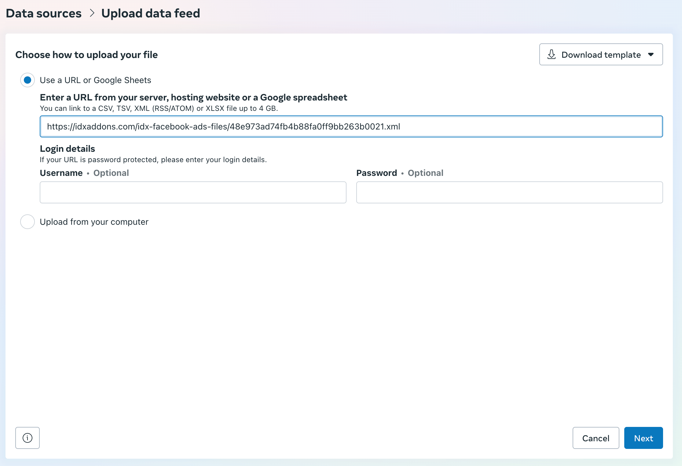 Paste the XML file URL in the URL field and then click on Next.