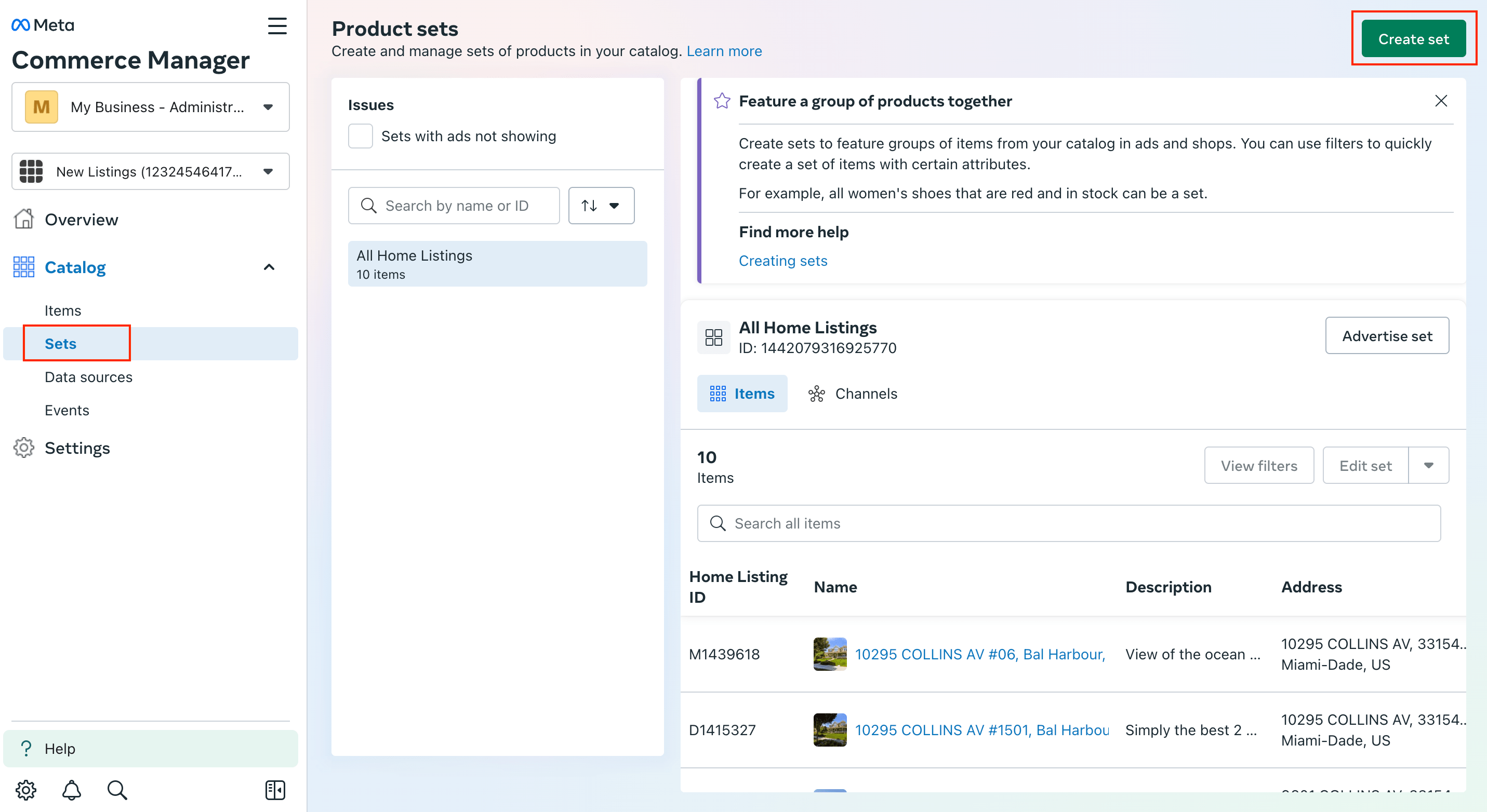 If you want to create a Set with the listings, click on Sets in the left sidebar, then click on Create Set.