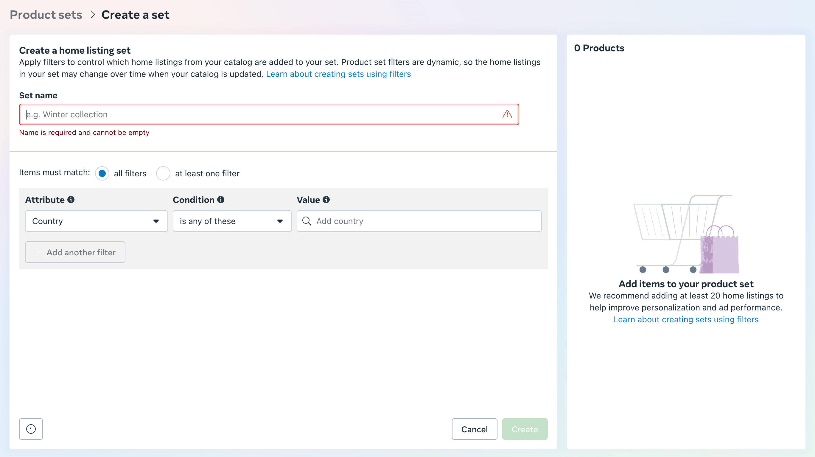 Add a name to the Set, and add a filter to select the listings you want to include in the Set.