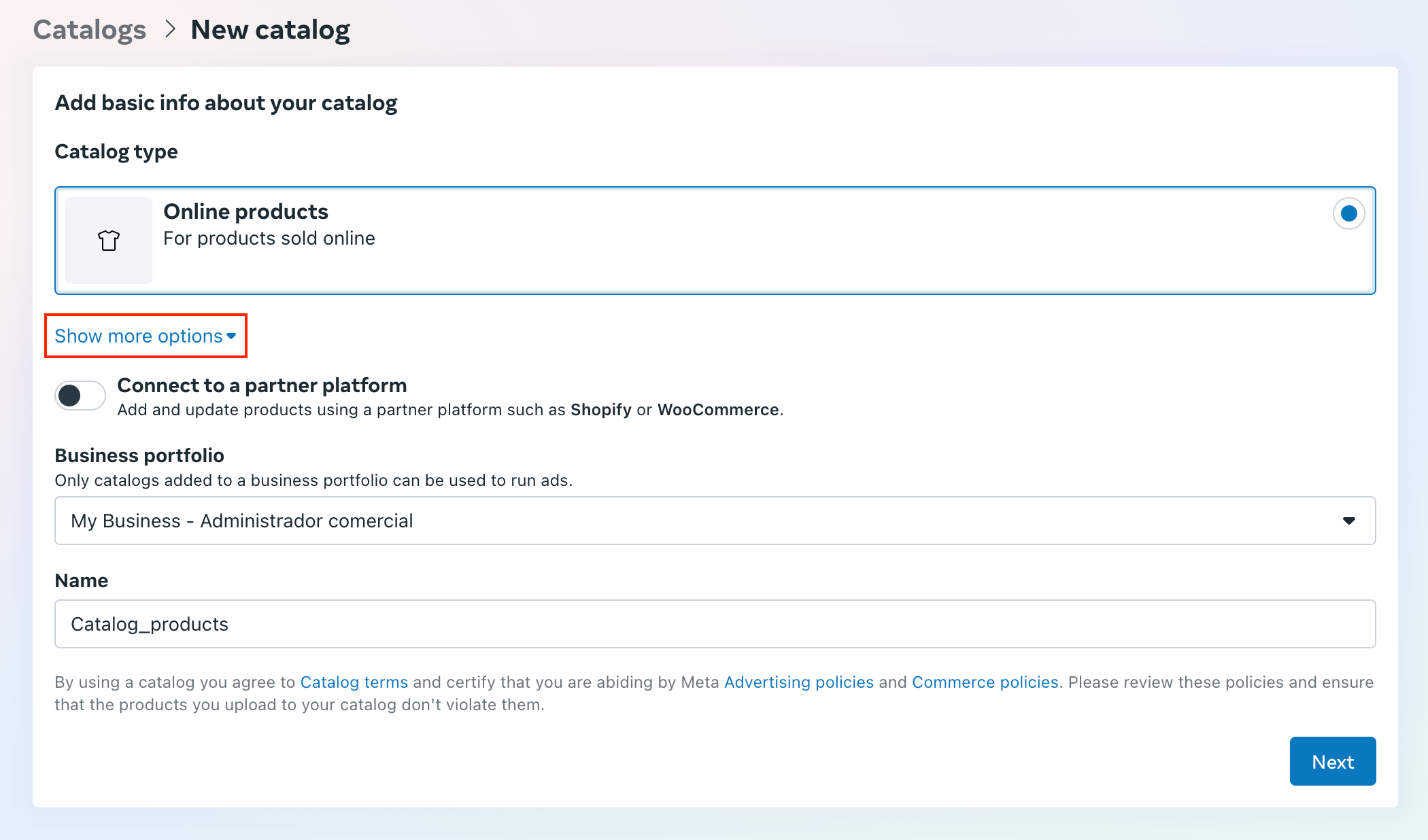 Select the Owner of the catalog, add a Catalog name, and then click on Next.