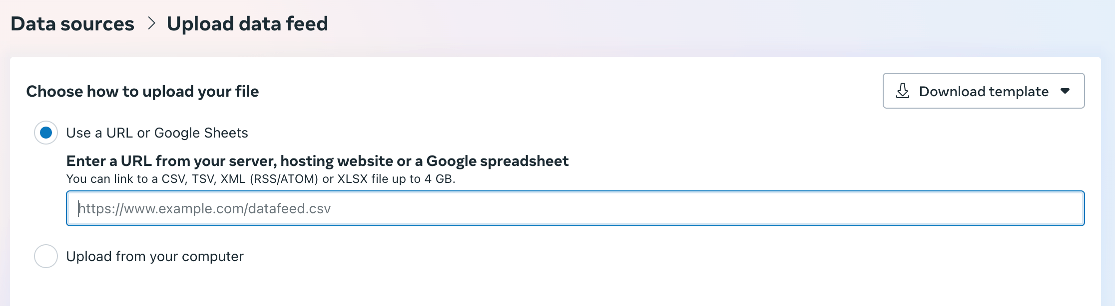 There you can see the steps to add the XML file URL to your Facebook Business Manager.
