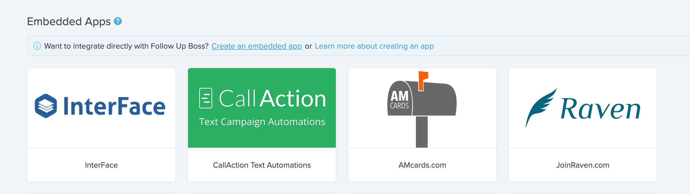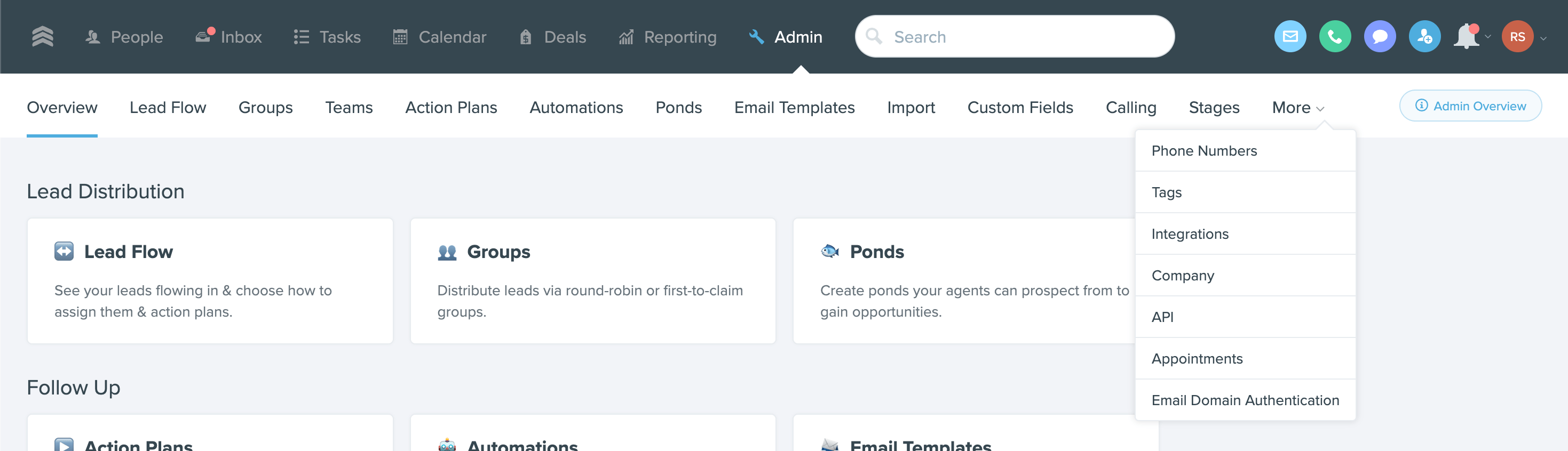 In your Follow Up Boss dashboard, locate the Integrations section under Admin. You can find it either by going to Admin > More > Integrations or Admin > Integrations.