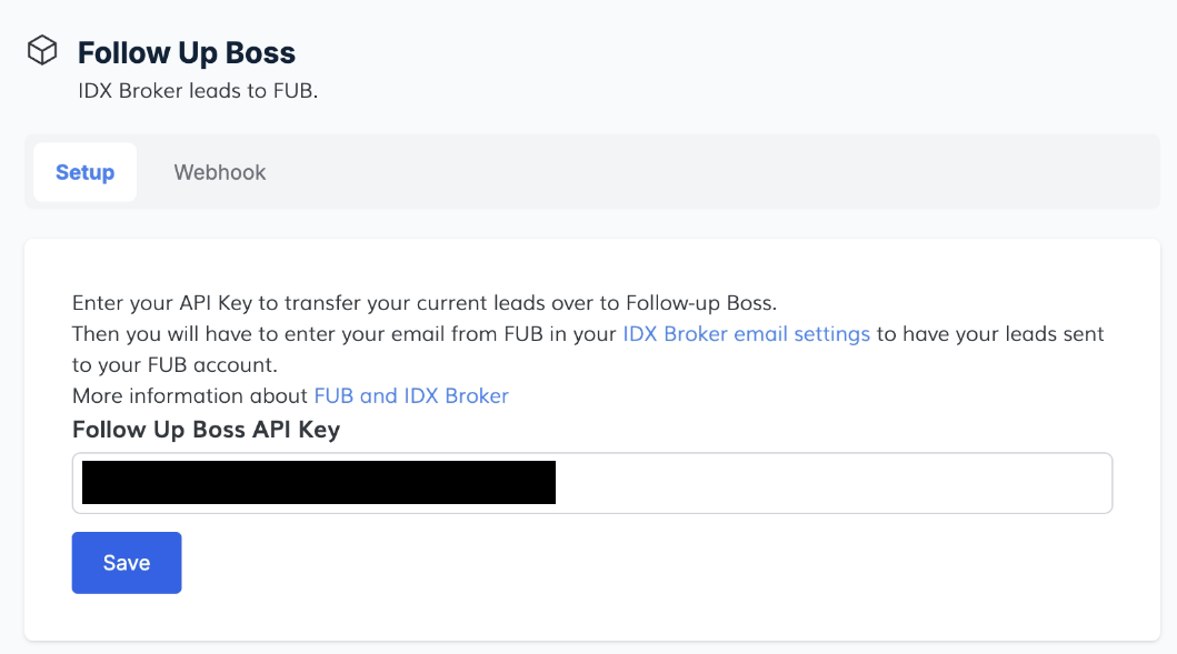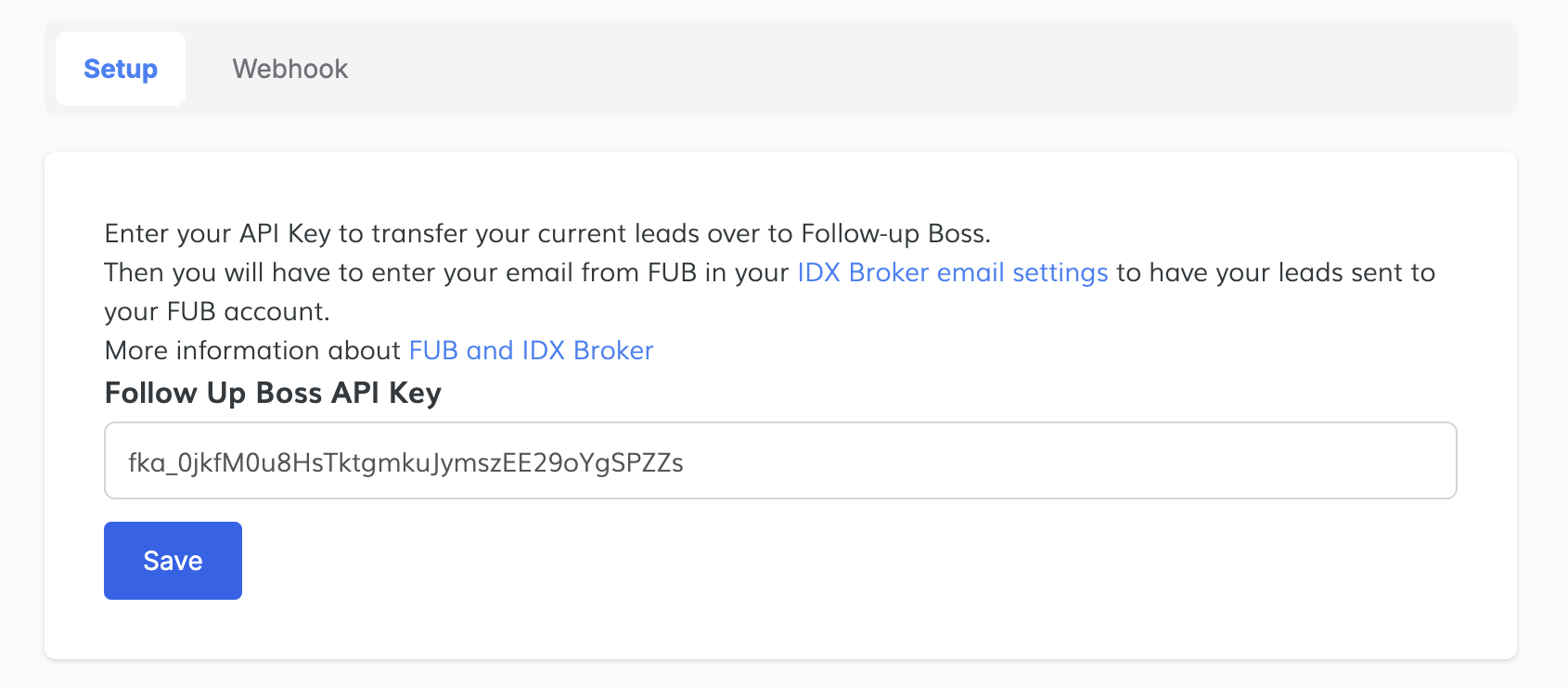 Paste your Follow Up Boss API Key and click on the "Save" button.