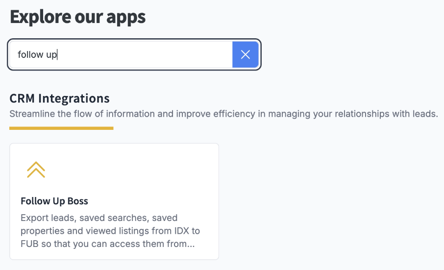 Search for the Follow Up Boss integration.Go to the 'Apps' section under the IDX Addons dashboard menu.
