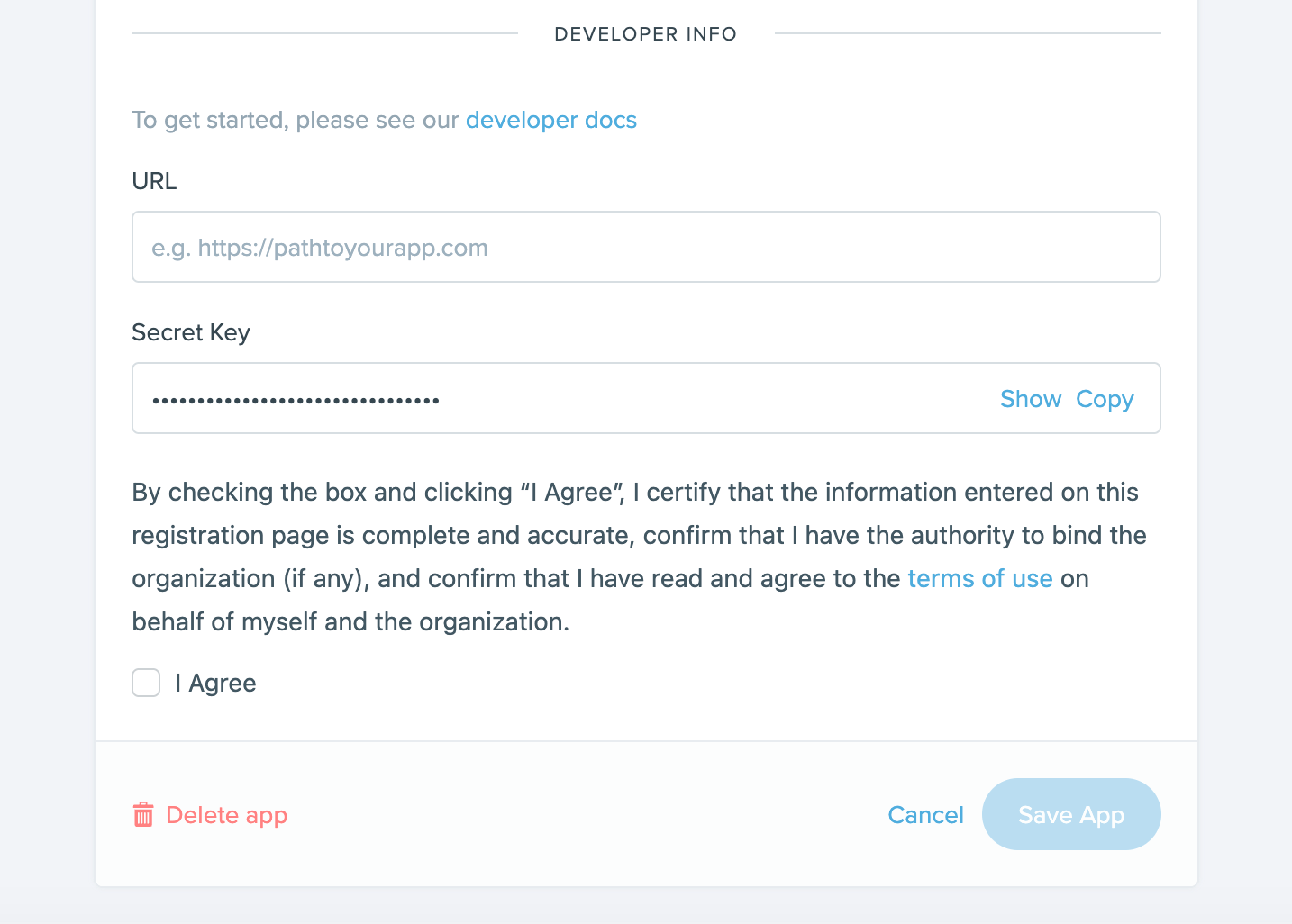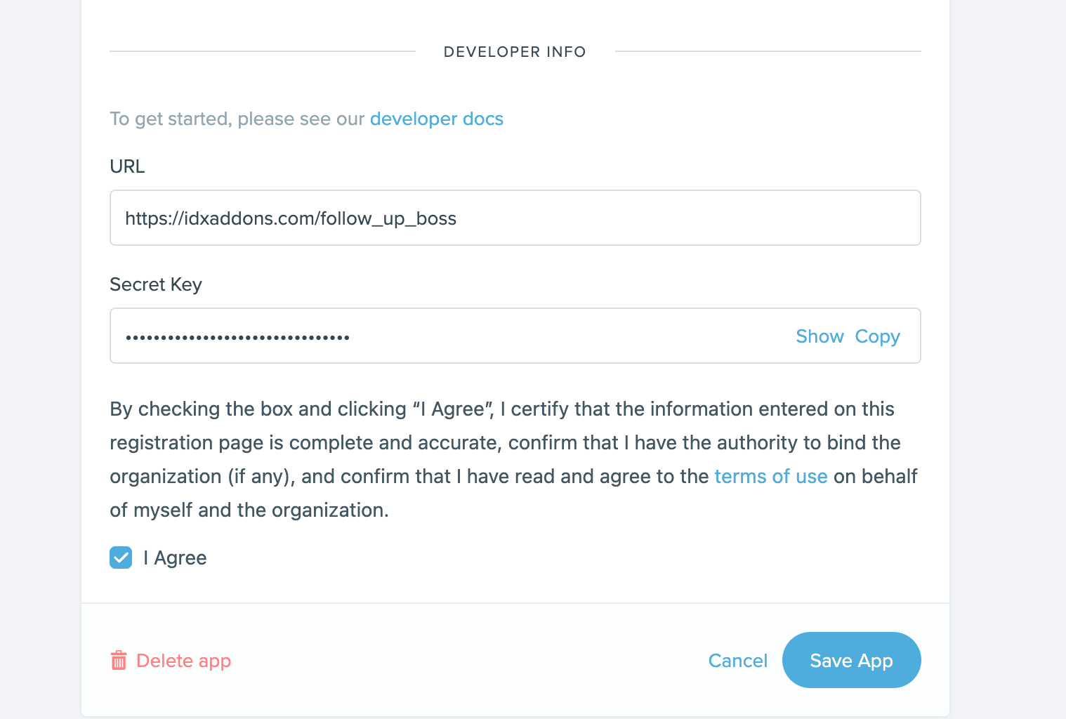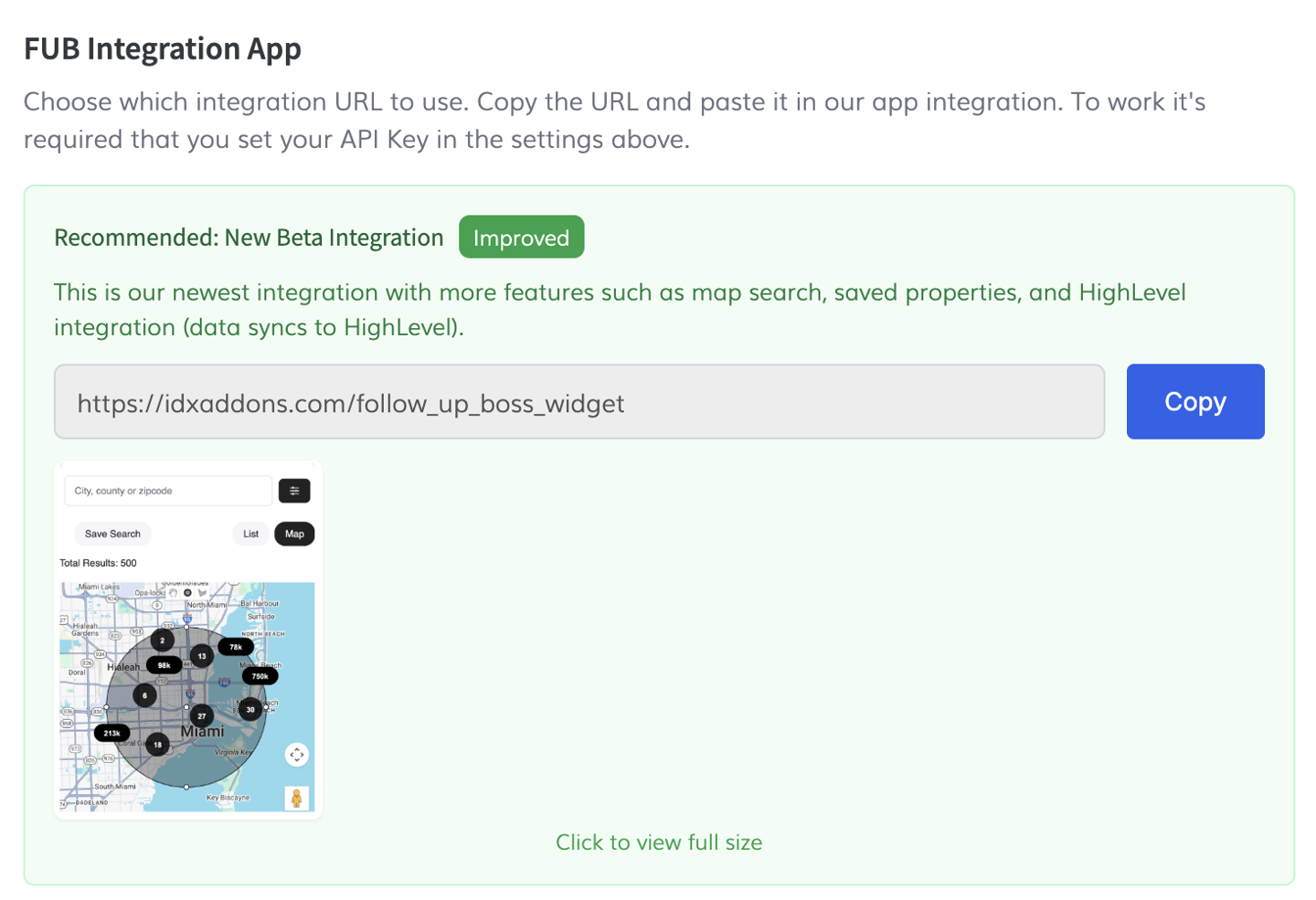 Scrolling down you will found the FUB Integration App section. Copy the link manually or by using the copy button, then return to your Follow Up Boss site.