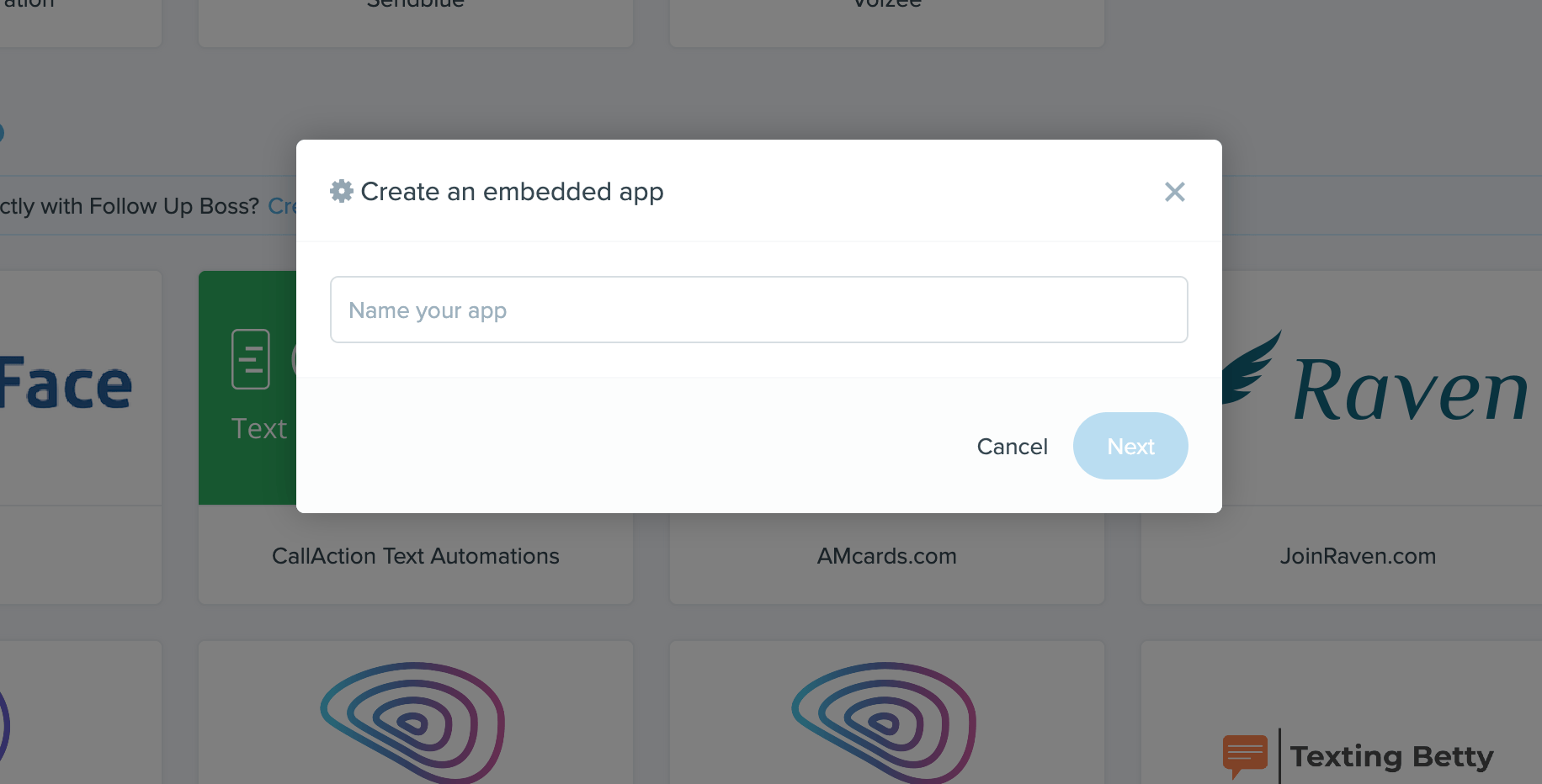 After clicking on it, a modal will appear where you can enter your desired name for the embedded app. Once you've added the name, click 'Next'.
