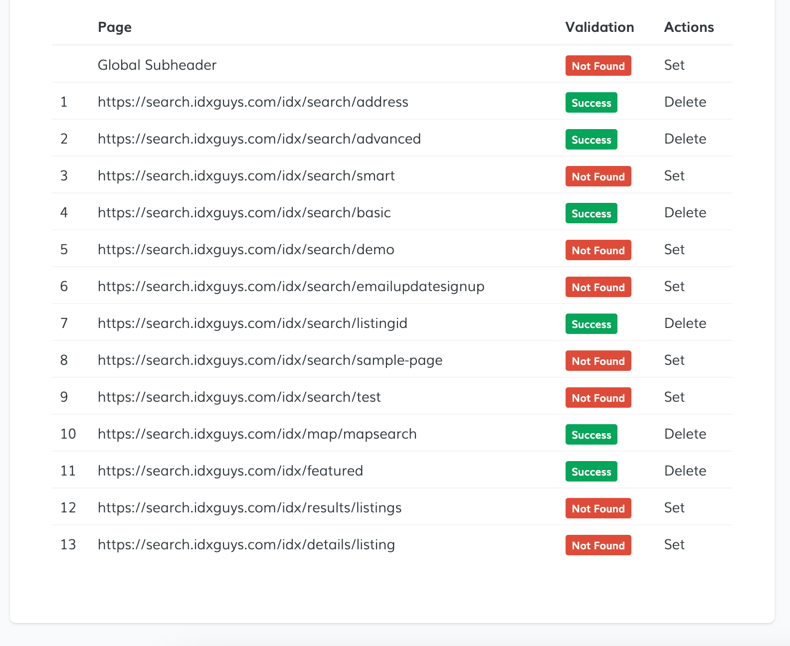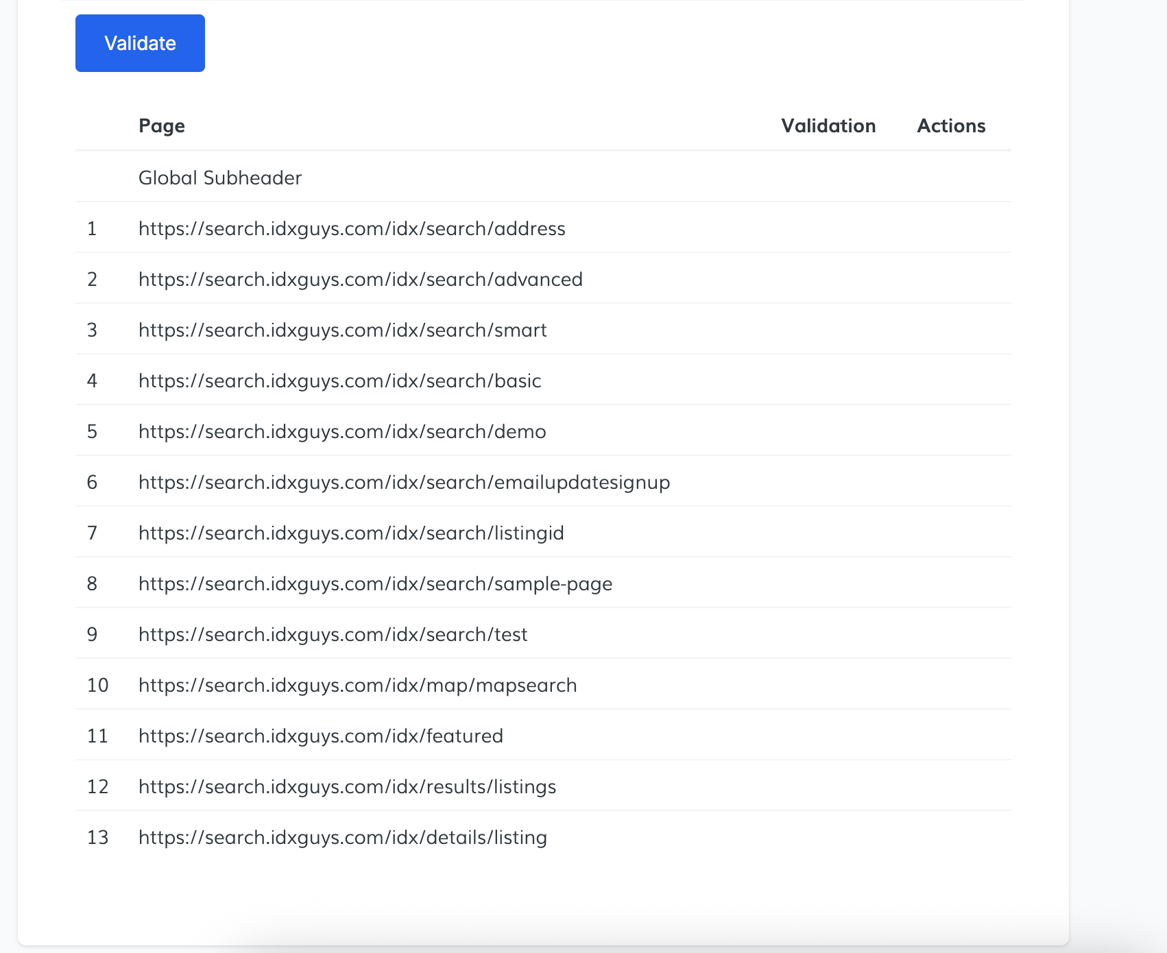 This will start validating which IDX pages have the webhook properly set. You’ll see a list showing the validation status per page.