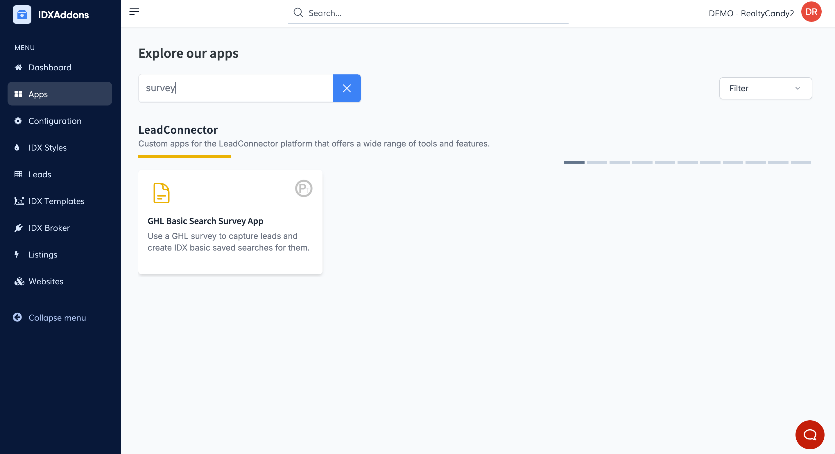 In the main menu, select the GHL Basic Search Survey App option.