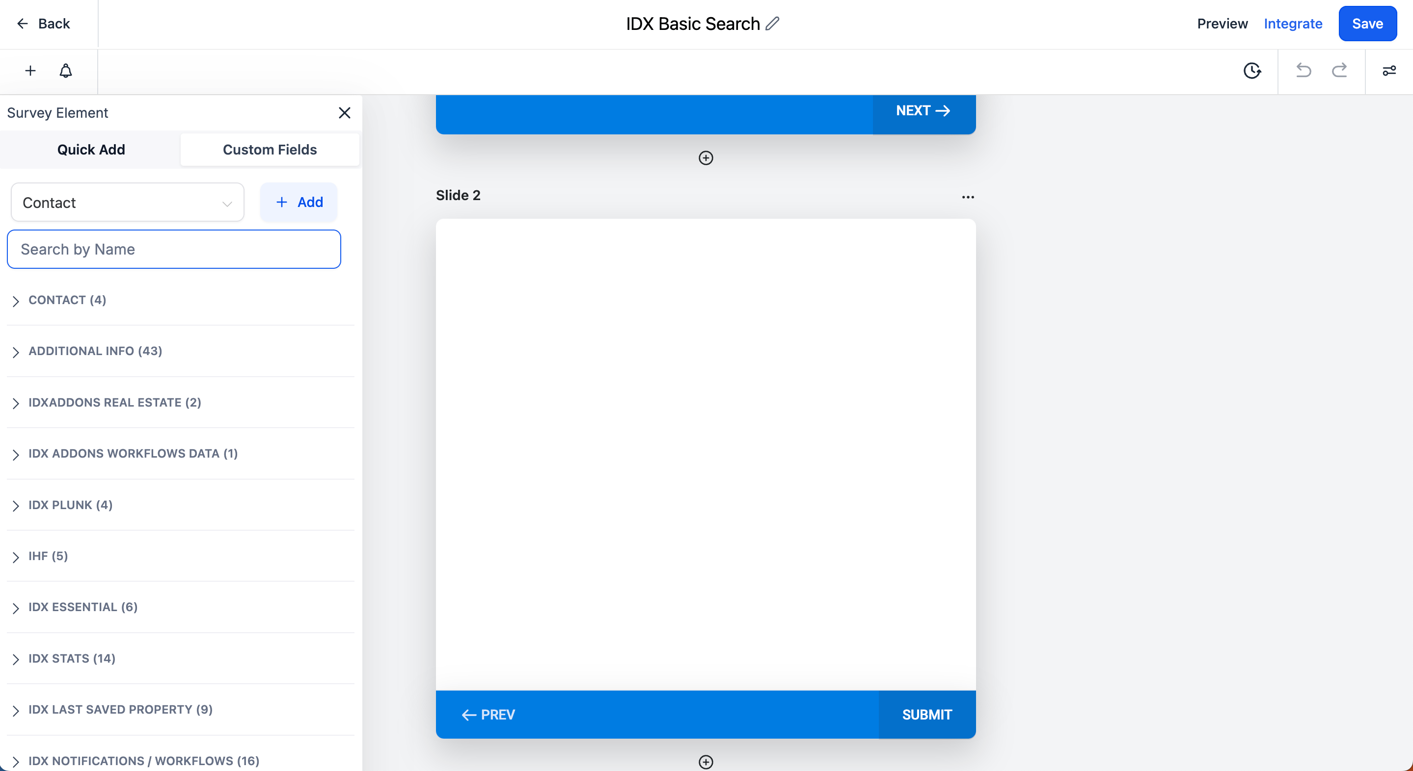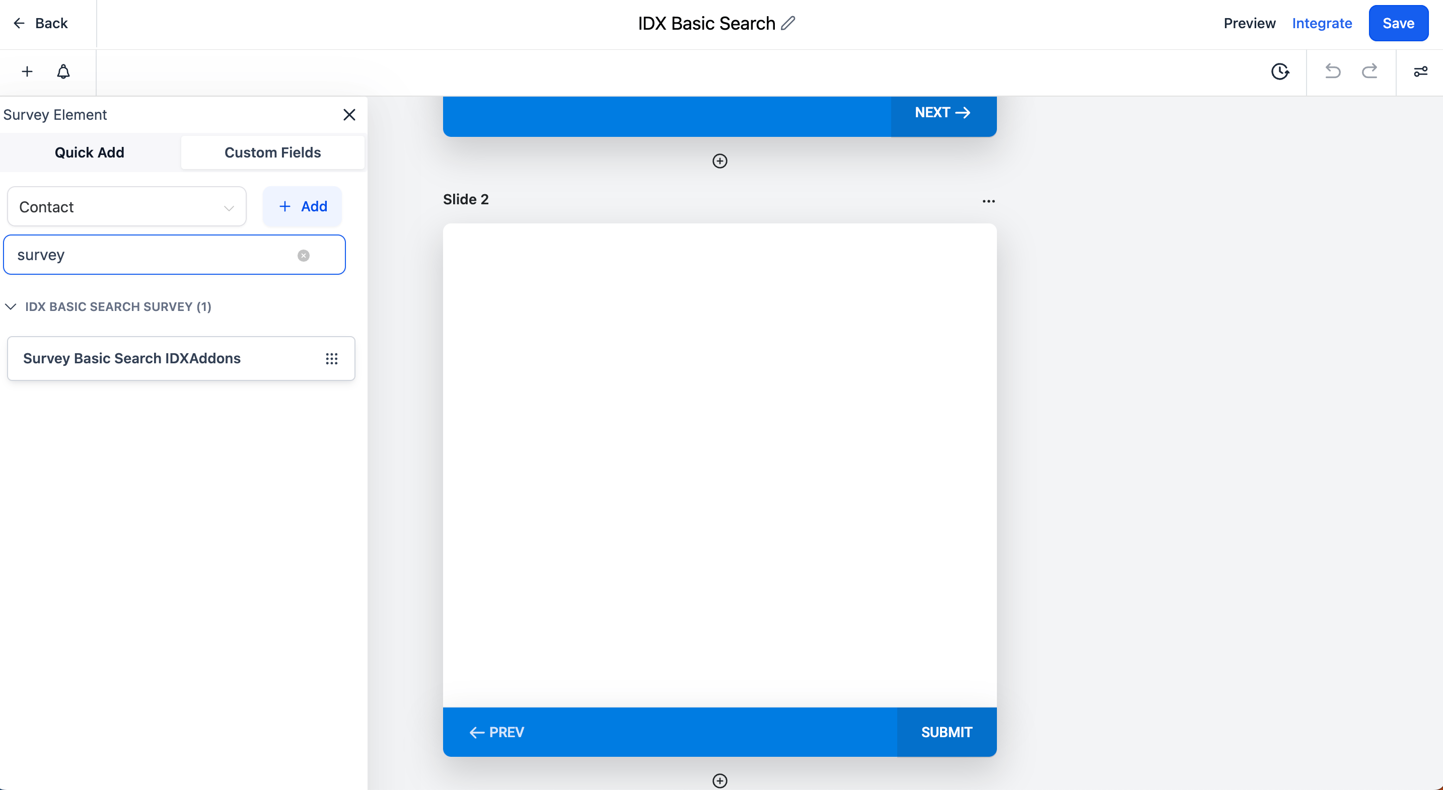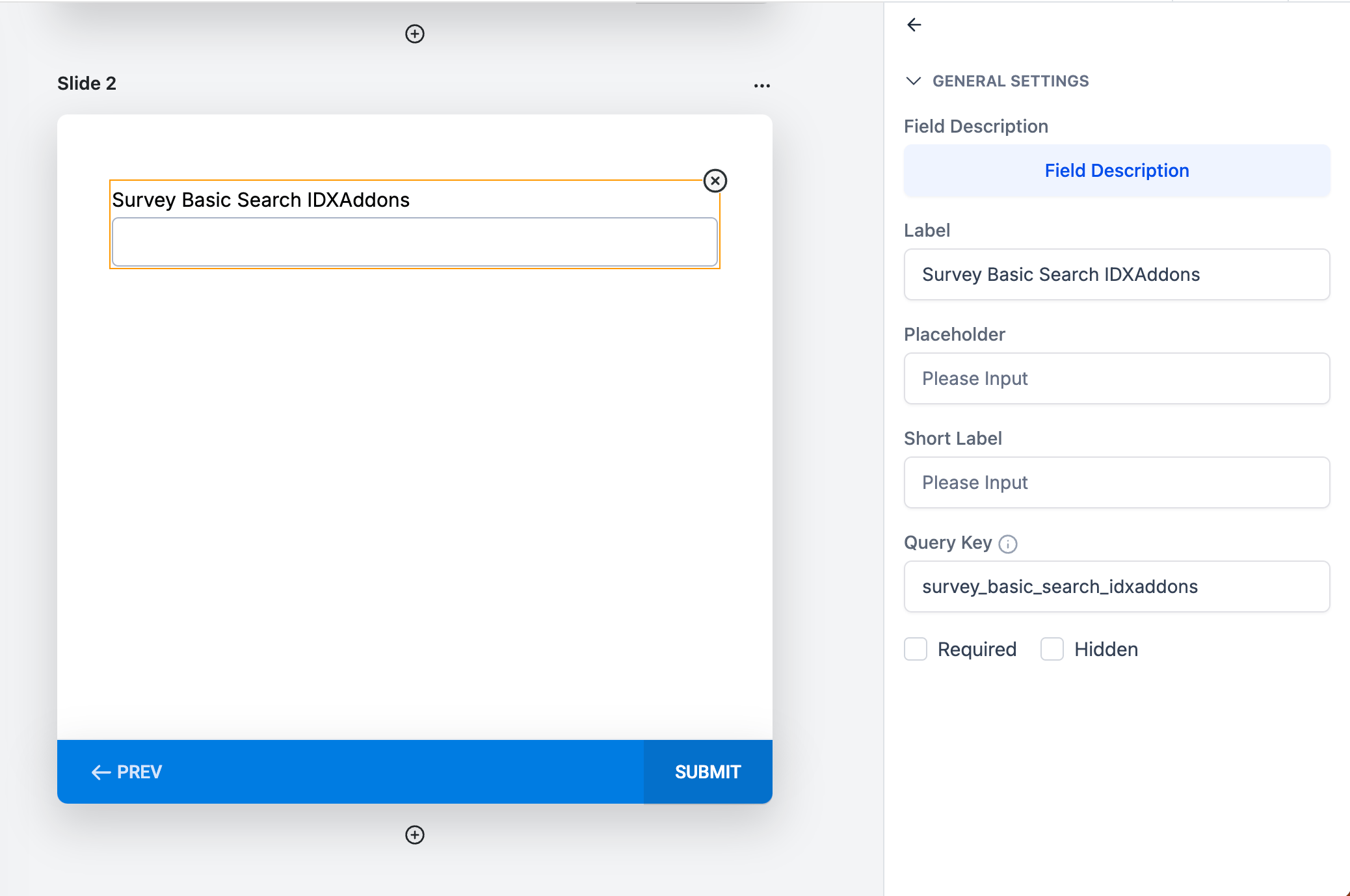 In the second slide, we are going to add the Custom Field that was created in the previous step: Survey Basic Search IDXAddons