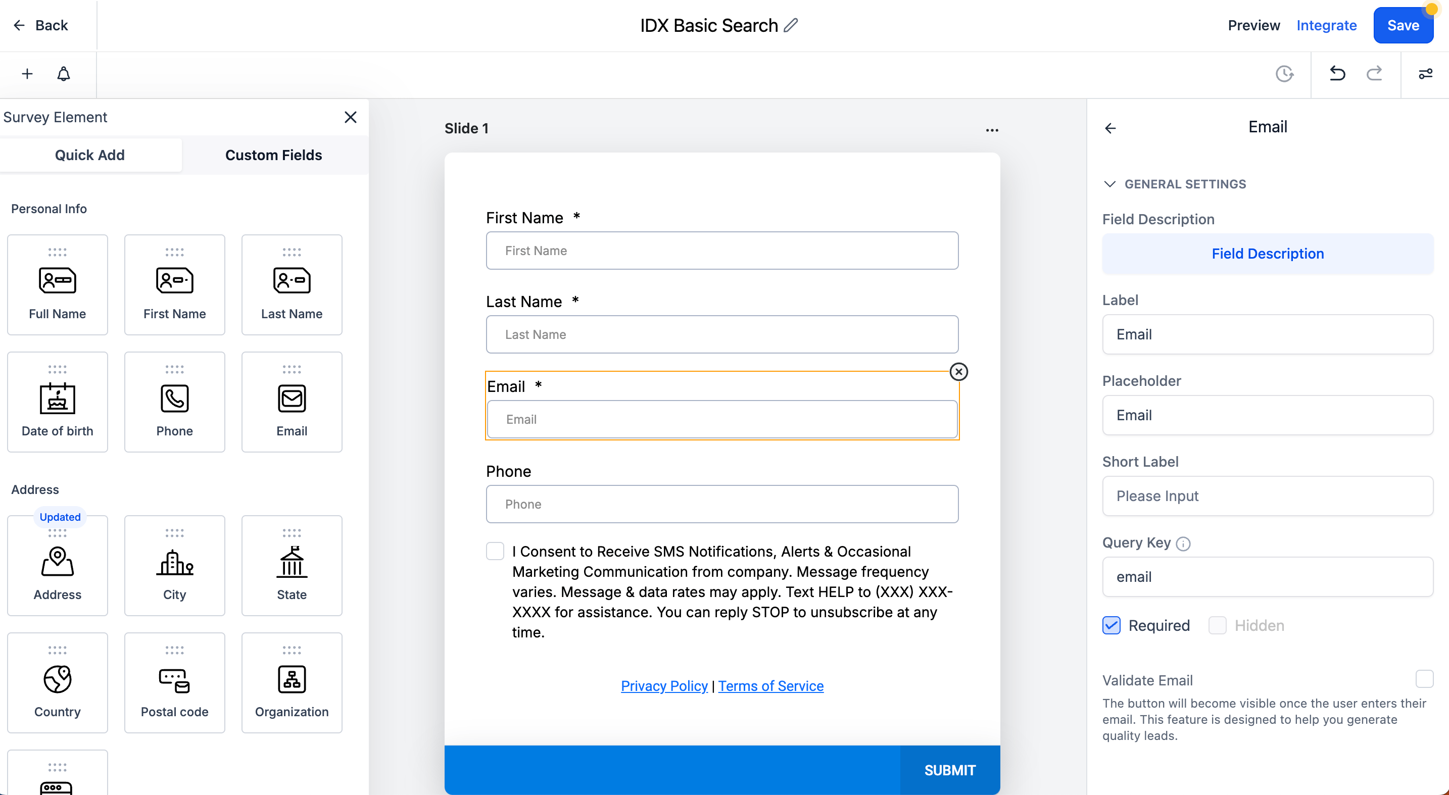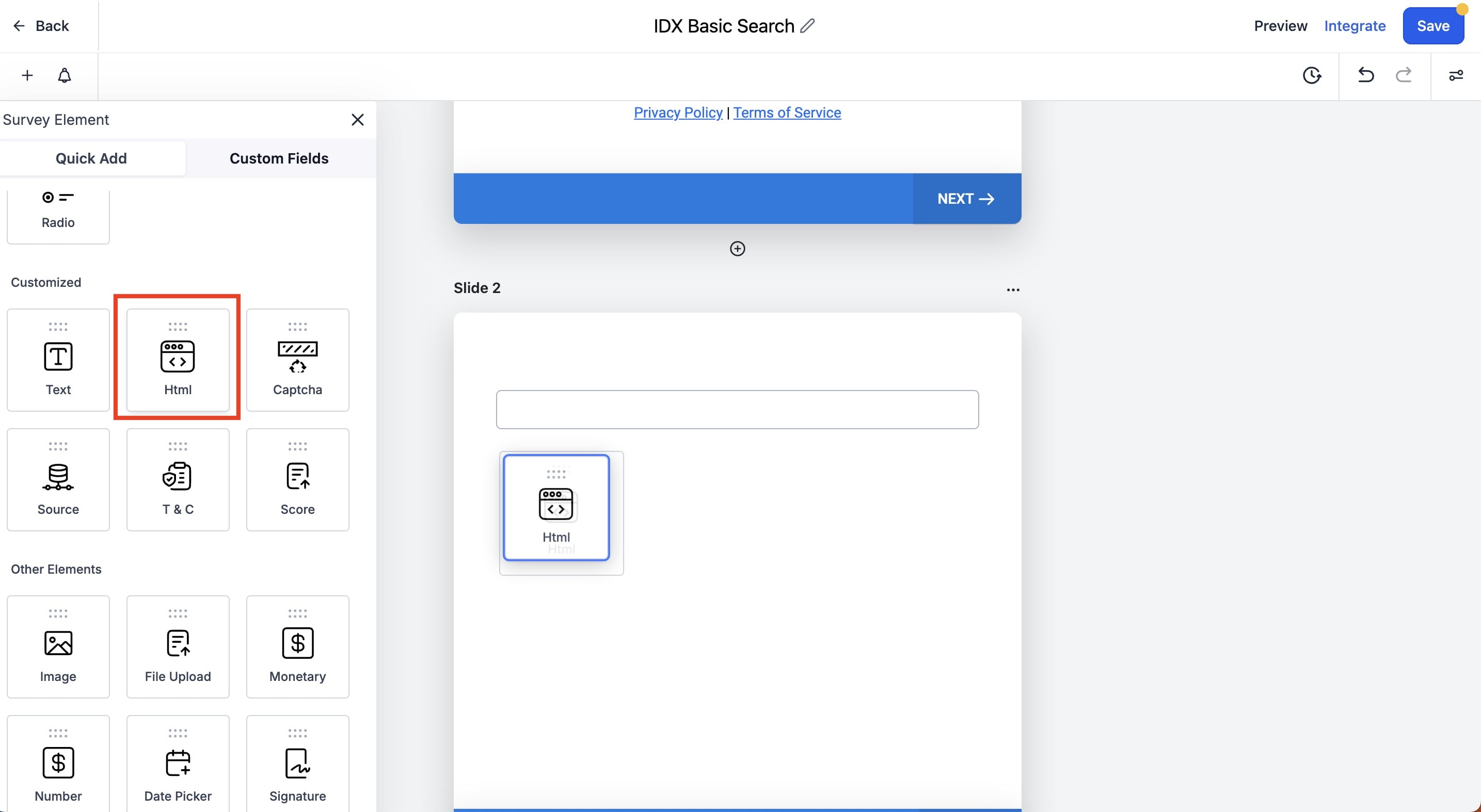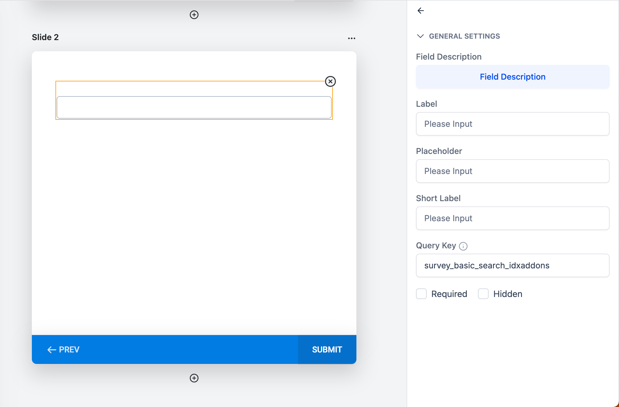 In the second slide, we are going to add the Custom Field that was created in the previous step: Survey Basic Search IDXAddons