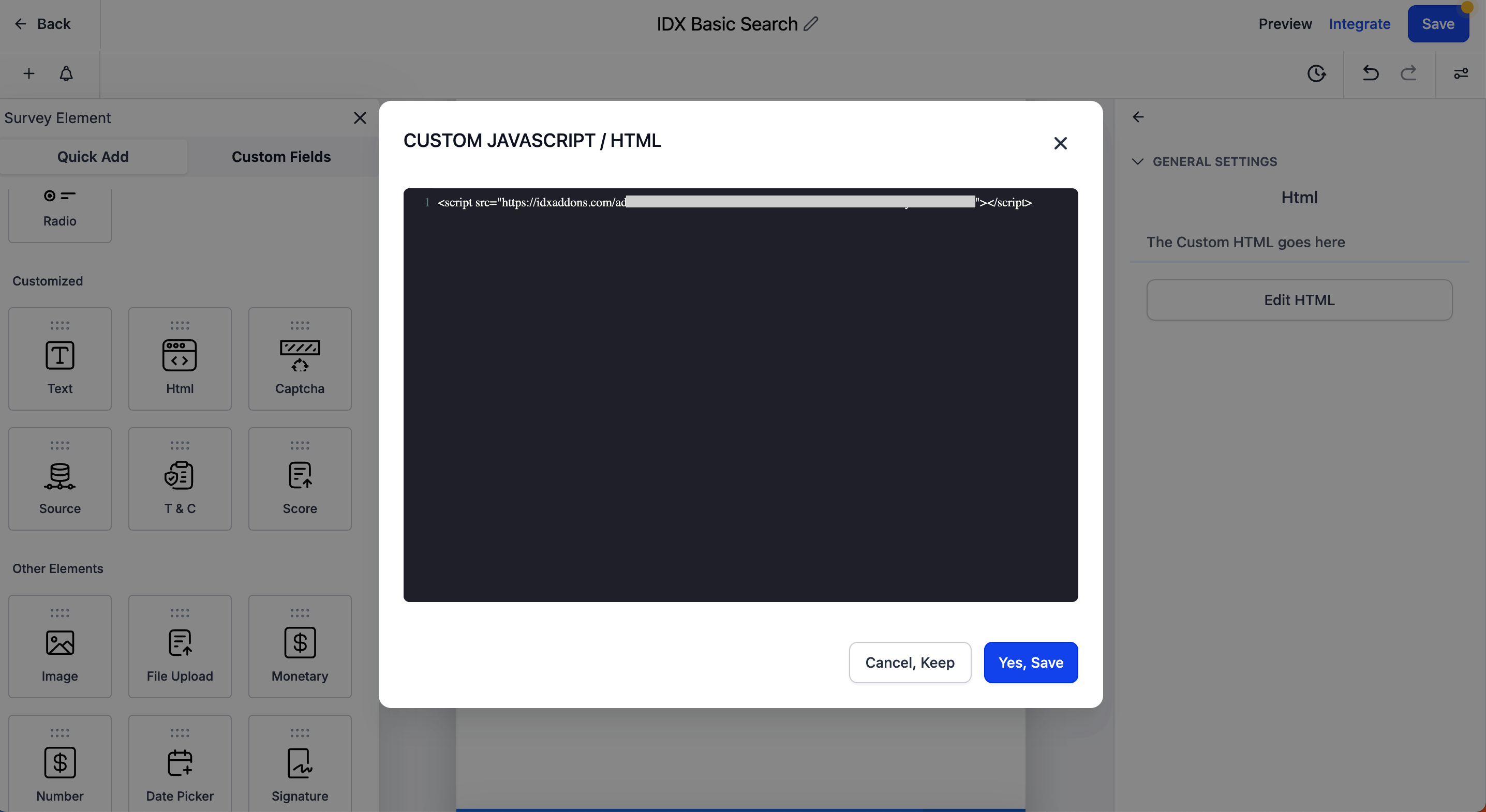 Paste the code snippet in the custom HTML element and click on Yes, Save