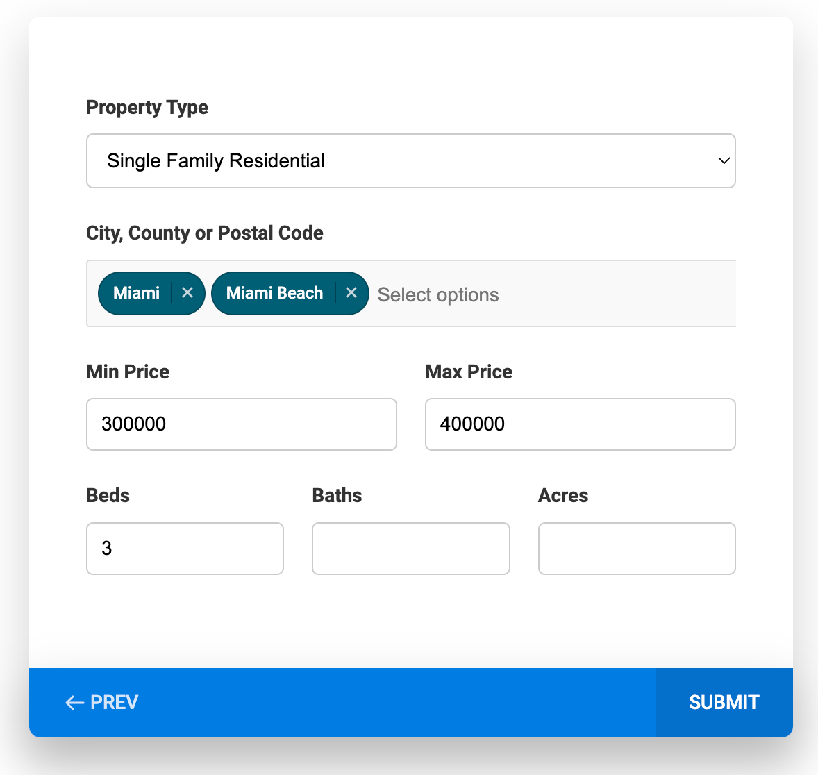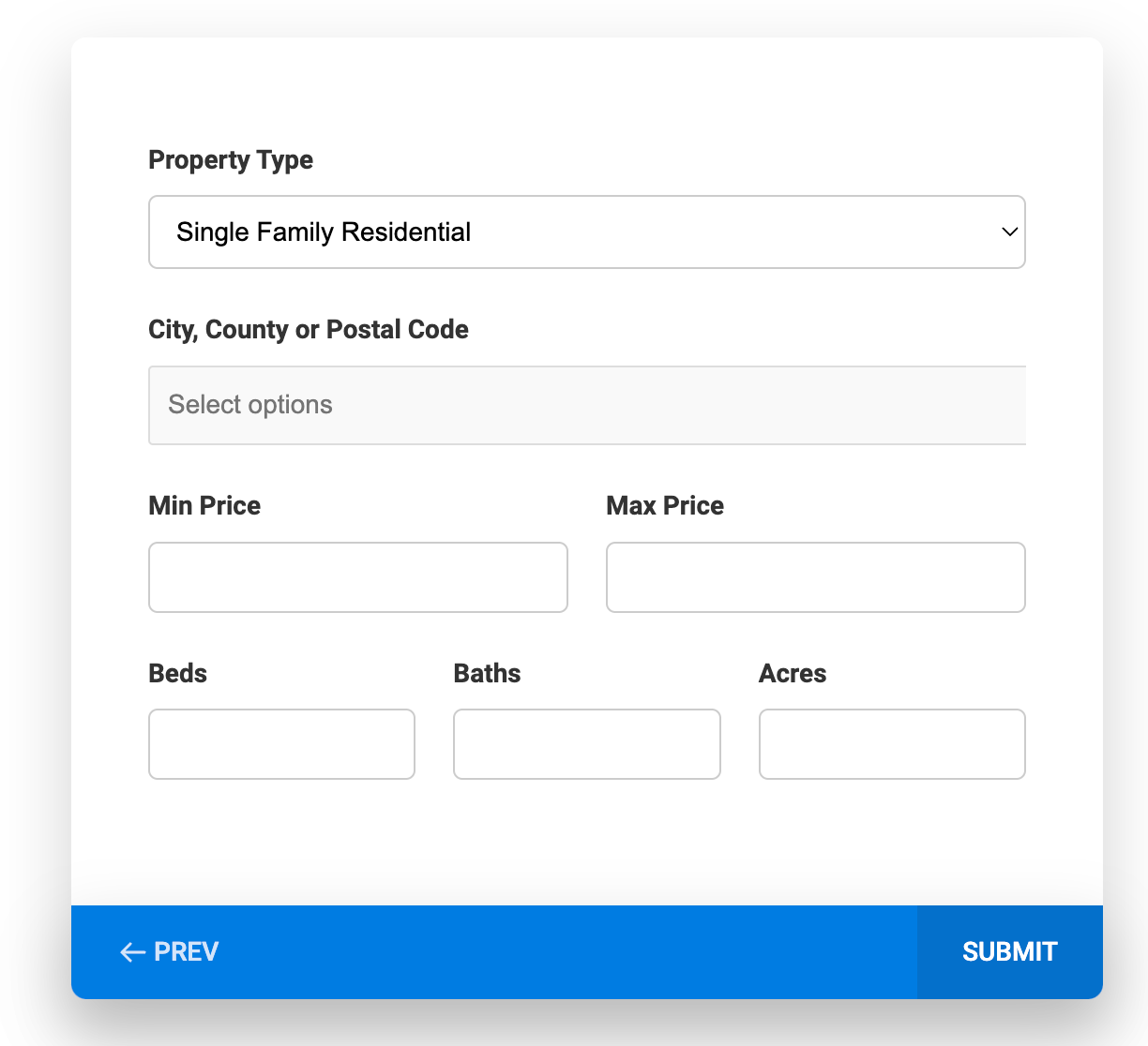 Now you will see the second slide with some basic search field options, such as property type, location, price, beds, baths, and acres.