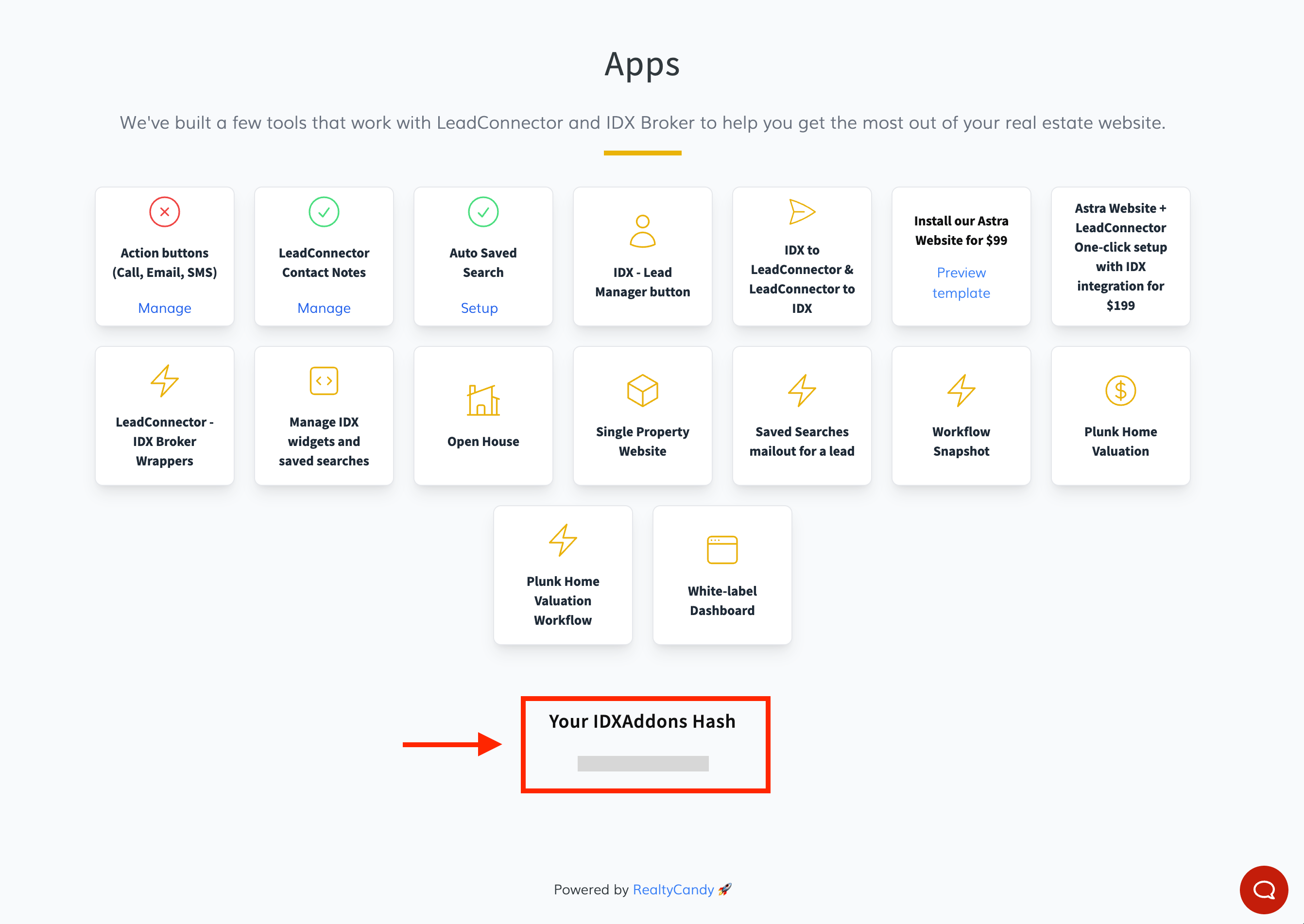 You can find the IDXAddons Hash in the LeadConnector dashboard app, at the bottom of the page.