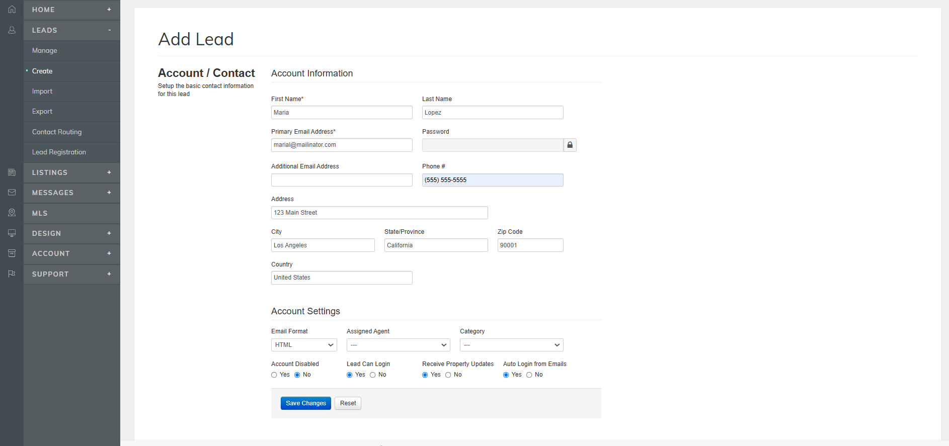 1) Create a New Lead in IDX BrokerGo to the IDX Broker dashboard, navigate to Dashboard > Leads > Create