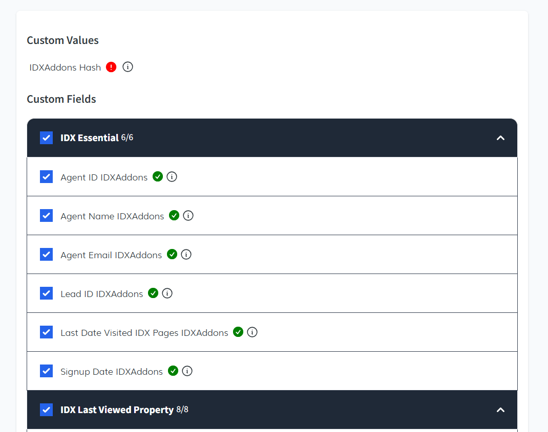 By default, when the LeadConnector Dashboard wizard is run, all custom fields and values are added. However, if for any reason a field is missing, you can manually add it in this section, just click on the checkbox next to the field you want to add.