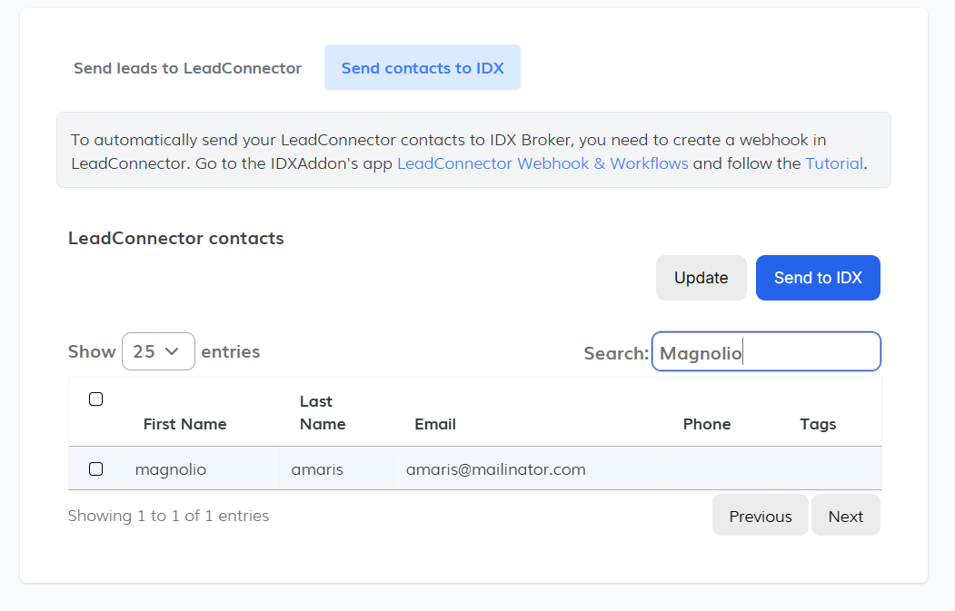 This tab allows you to manually send contacts from HighLevel to IDX Broker. Follow these steps to use the feature effectively:
