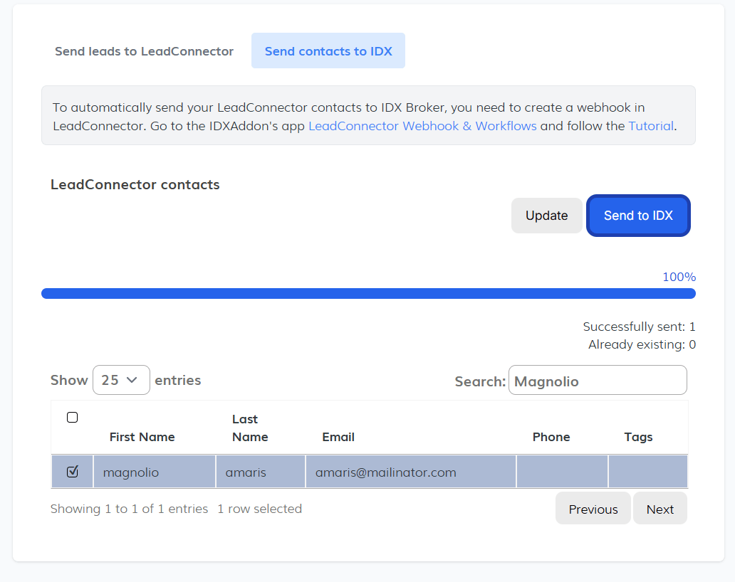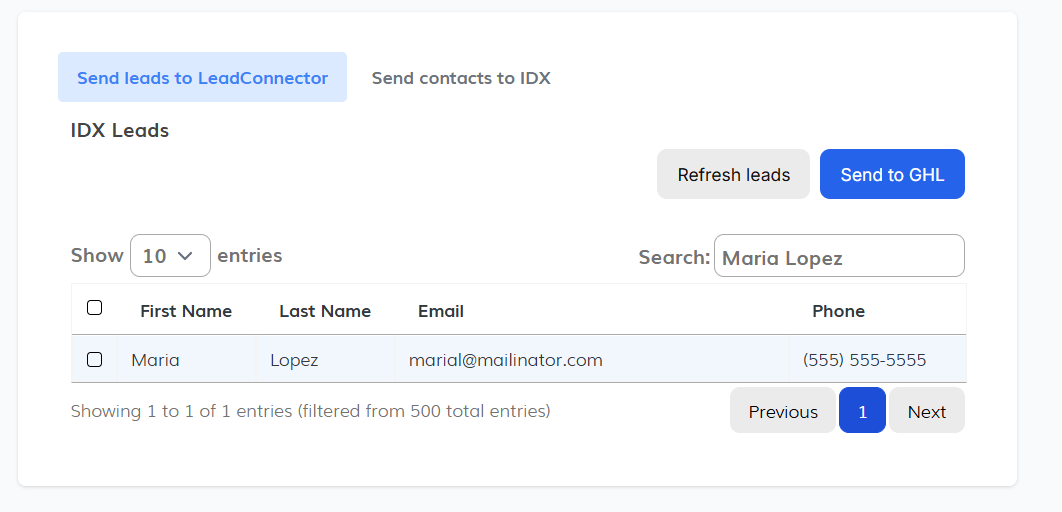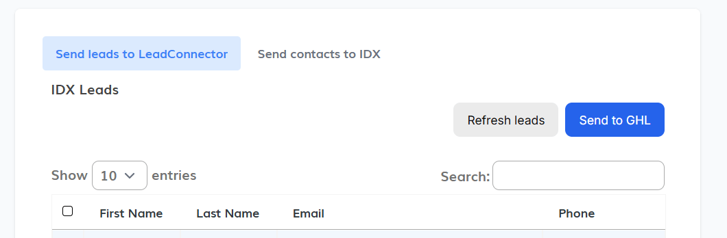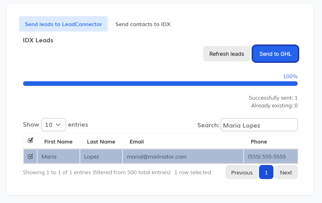 5) Send an IDX Lead to HighLevel- Select the lead you want to send from the table.