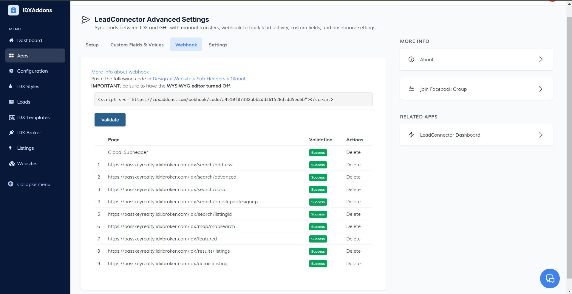 This code snippet appears under the Sub-header of IDX Broker. Here, you can validate whether the webhook has been correctly added to the pages. To do this, click on the Validate button, and the system will indicate which sub-headers have been added and which ones have not. If any are missing and you'd like to add them, simply click Set, and they will be automatically added.