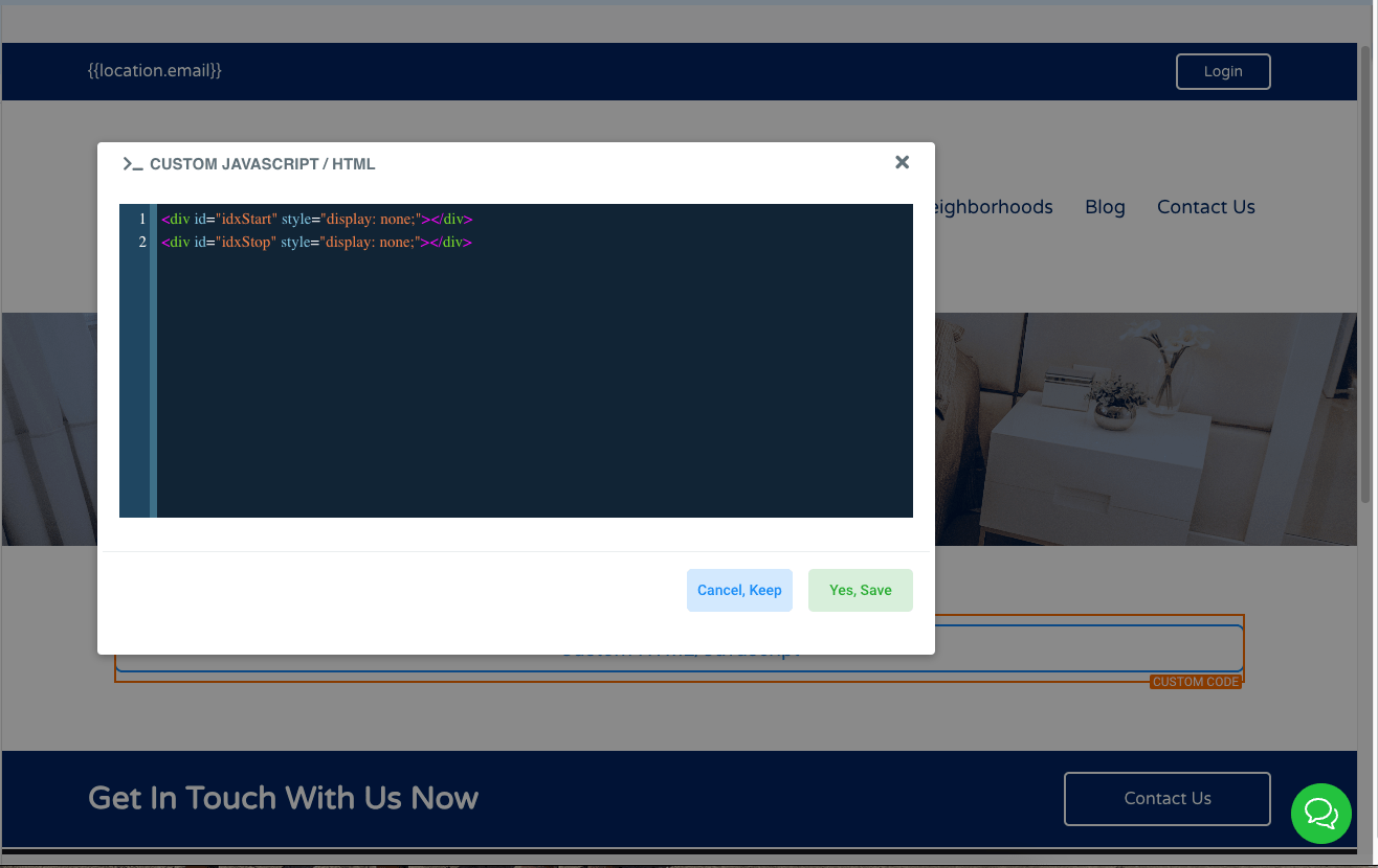 Add the following custom HTML tags. The HTML "IDXStart" and "IDXStop" tags that you paste into the body are what tells the IDX system where to insert the IDX content.