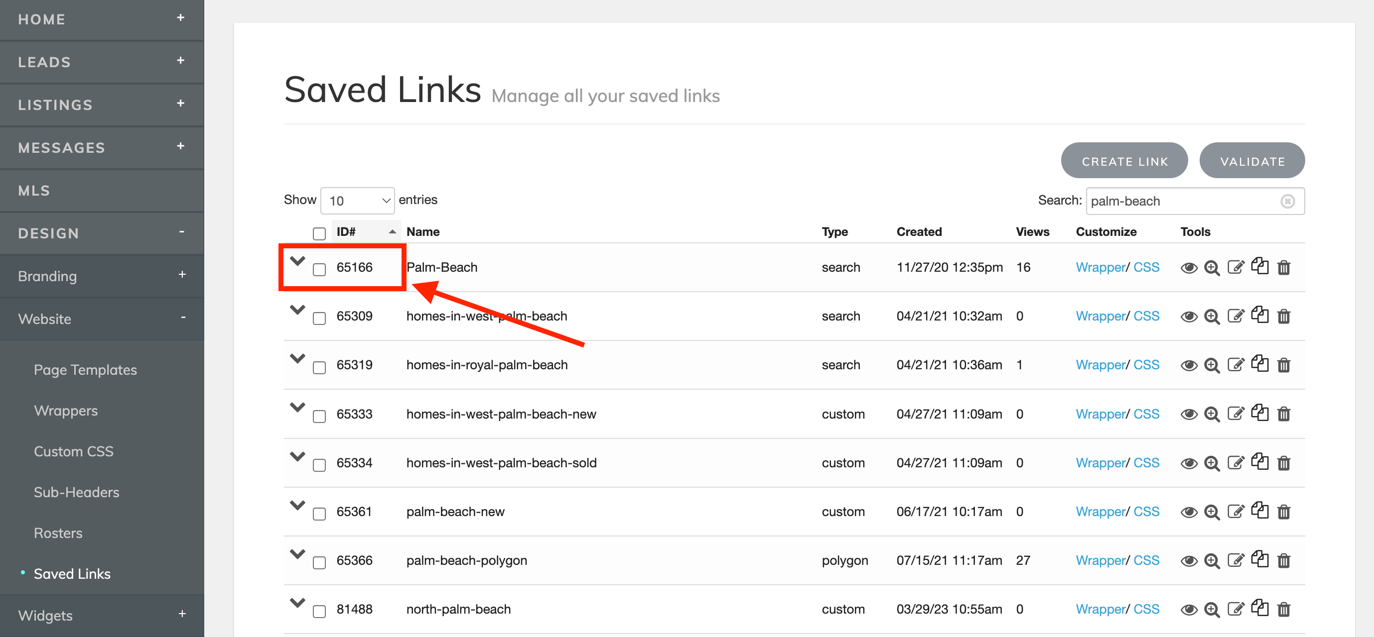REPLACE_SAVED_LINK_IDwith the saved link ID you want to assign to the contact.To get the saved link ID, go to your IDX Broker account under Design > Website > Saved Links and look for the saved link you want to assign to the contact. The ID will be in the first column.