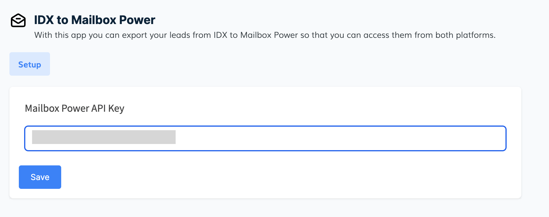 In IDXAddons, open the Mailbox Power app, paste the key in the Mailbox Power API Key field, and click Save.