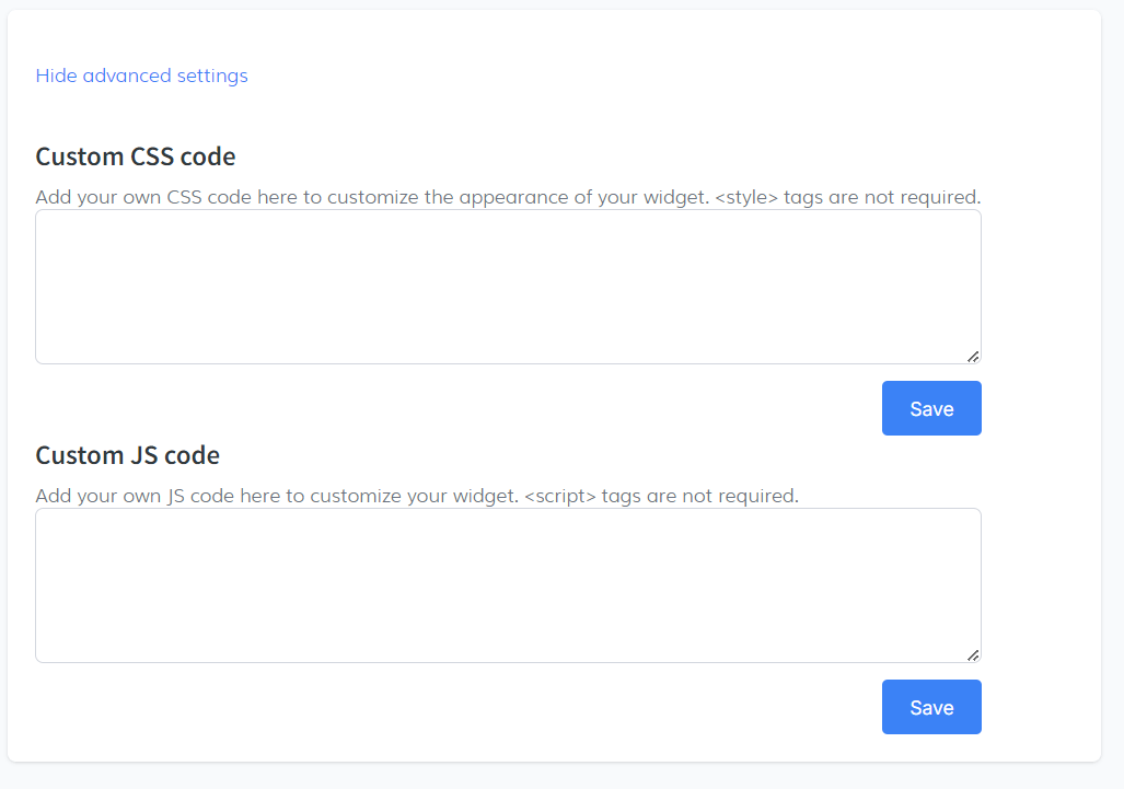 - Custom JS Code: You can also add JavaScript code to customize the widget's behavior. script tags are not required.