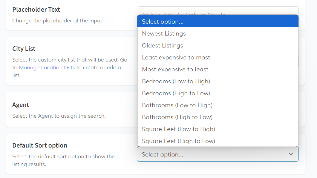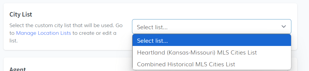Choose the custom city list for the search bar from the dropdown menu. The available options will be based on the lists you have created in the IDX Broker account. Manage your city lists.