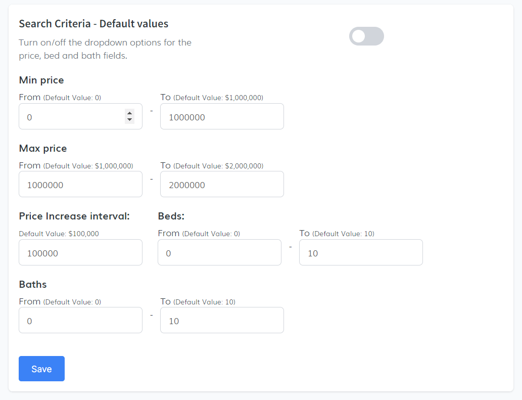 To start, you can turn on or off these dropdown fields using the Toggle button. When the toggle is on, the fields for price, beds, and baths will appear as dropdown menus, where users can select their options from preset values. If the toggle is off, these fields will not be shown in the search tool.