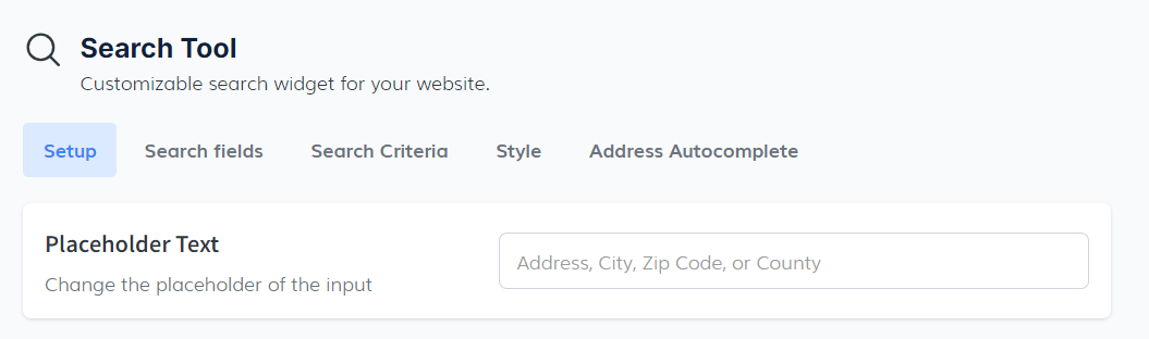In the Setup tab, you can modify the placeholder text that appears in the search bar. This customizable text helps users understand what to input, such as Address, City, or Zip Code, making searches more intuitive.